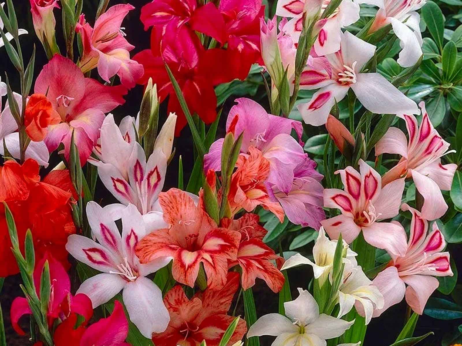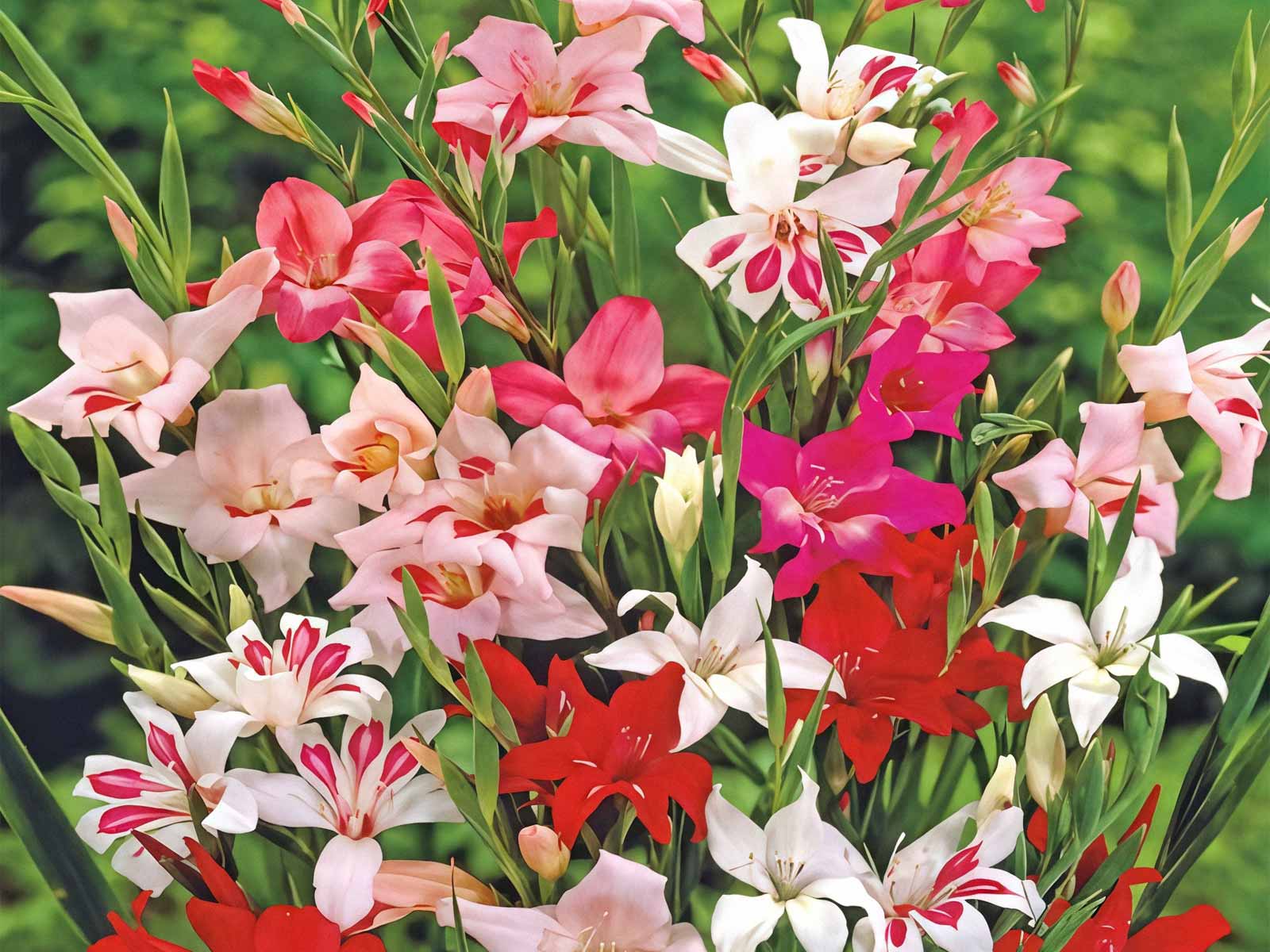 Gladiolus ‘Nanus’ is a compact and graceful variety known for its delicate, star-like blooms and slender spikes. Unlike taller gladiolus types, ‘Nanus’ grows to a more manageable height, making it ideal for smaller gardens, borders, containers, and cut flower arrangements. The flowers typically appear in soft shades of pink, white, and red, often with subtle markings or contrasting throats.