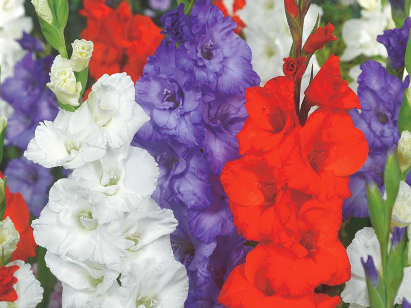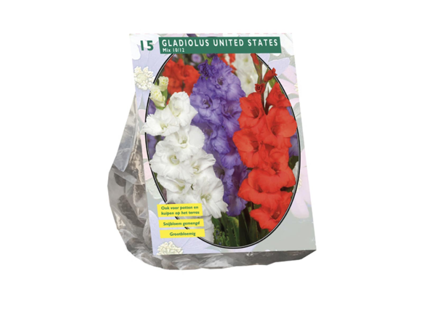 Gladiolus United States Mix is a bold and patriotic blend of tall flower spikes in classic red, white, and blue-toned hues. This eye-catching mix adds vibrant color and striking contrast to borders, beds, and cut flower arrangements, making it perfect for summer celebrations or adding a touch of Americana to your garden.
