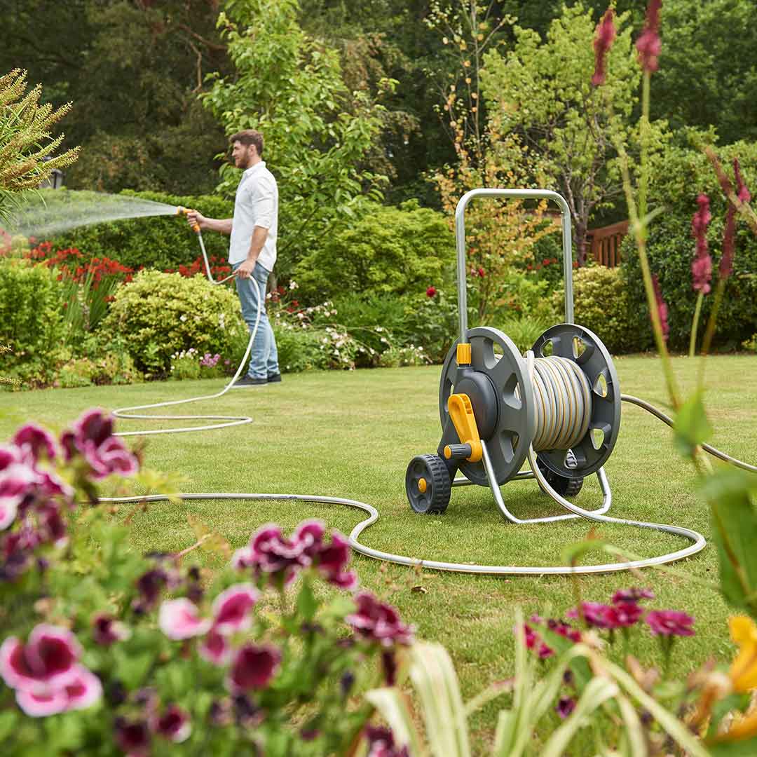 A free standing, wheeled Hose Cart with an adjustable handle for easy movement around the garden. Supplied with 25m of 12.5mm hose.