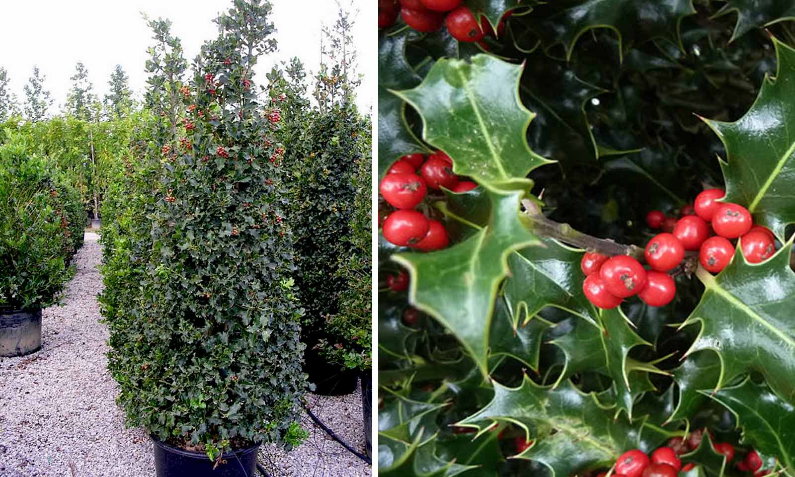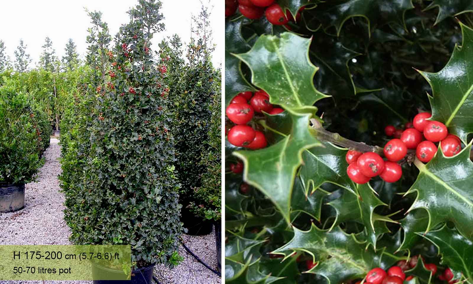Common English Holly is a medium-sized evergreen tree, which grows slowly when young, but speeds up a little as it matures. Its dark, glossy green, wave-shaped leaves are edged with spines and are a popular decoration at Christmas when combined with its seasonal red berries. Resilient against even the most extreme British weather, they bring rich colours to your garden throughout the year.