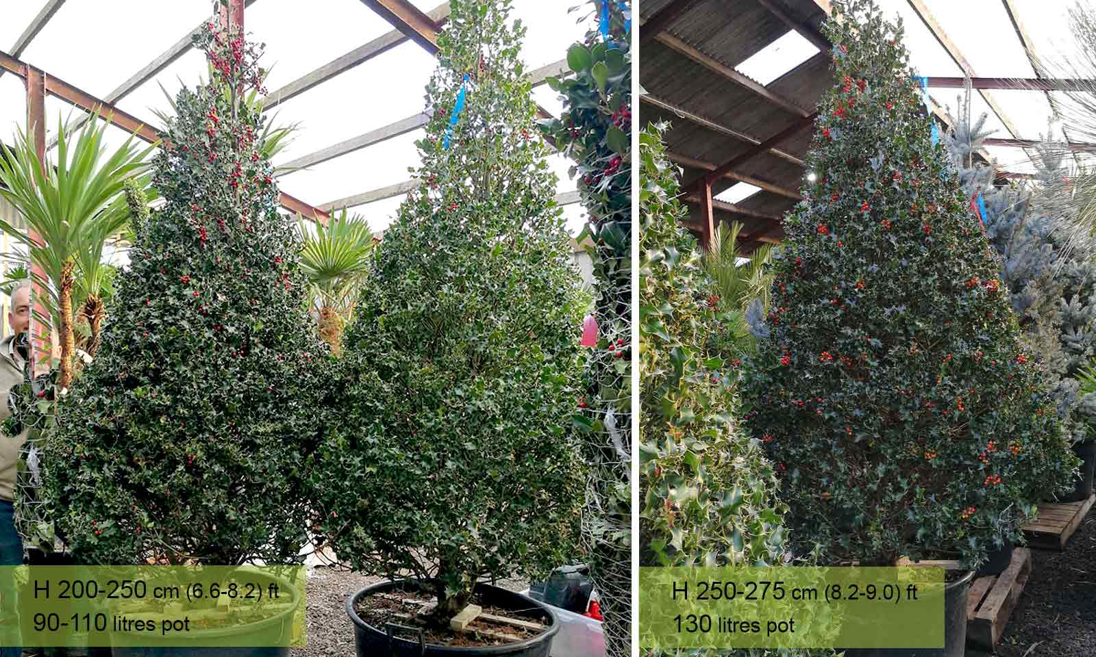 Ilex Aquifolium (English Holly) is an ideal topiary plant because of its slow growth and low maintenance requirements. Ilex Aquifolium is a hardy shrub that can grow almost anywhere except in extremely wet conditions. Common English holly, Ilex aquifolium, is the most popular holly species grown in British gardens and is widely used for decorations at Christmas. Holly is dioecious, which means there are separate male and female plants. The white flowers which appear in May are pollinated by insects and berries appear on female plants by late November. Holly berries are a good winter food source for birds. However, holly berries are mildly toxic to humans, causing vomiting and diarrhoea if eaten.