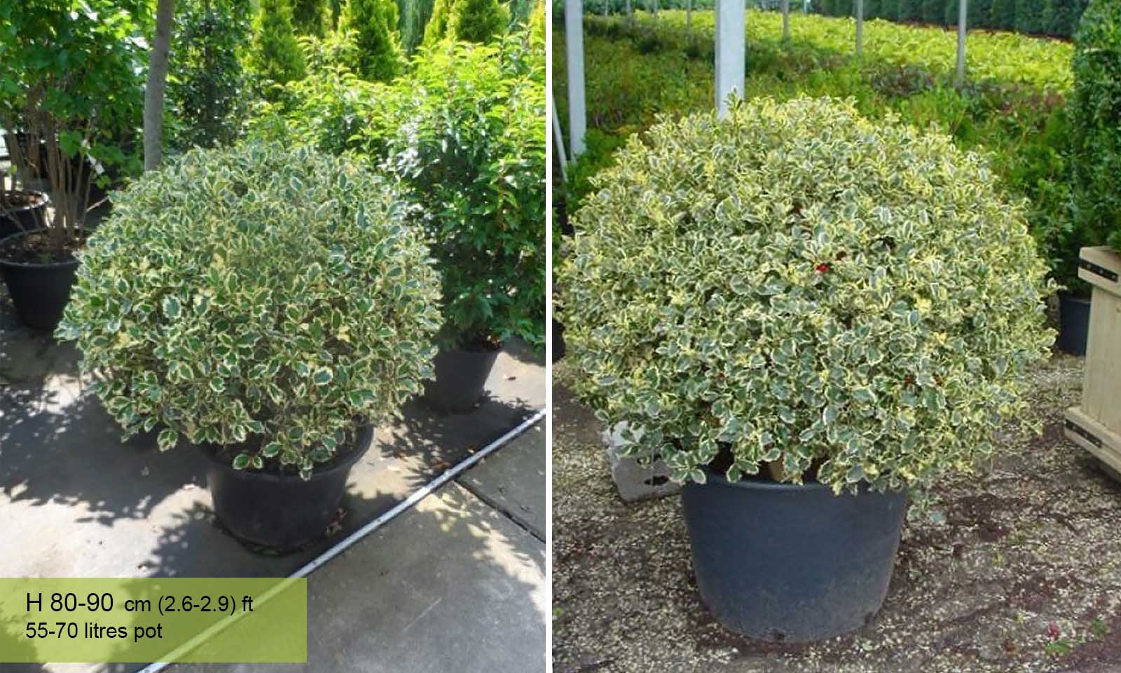 This stunning topiary is made from clipped Ilex Aquifolium ‘Argenteomarginata’ – the most beautiful and ornamental of all hollies. Evergreen shrub which grows irregularly in the first years, sometimes conical and sometimes rounded, but always dense. Later, if properly pruned (it withstands pruning very well), it becomes widely pyramidal. When grafted at the height of about 1 meter it becomes a small tree with round crown, one of the most popular. Leaves from ovoidal to lanceolate, up to 8 cm long and 4 cm wide, leathery and unevenly undulate at the edges with 7-9 prickly teeth on both sides and one sharp tooth at the tip. When the leaves begin to form in late spring they are tinged with purple creating an attractive contrast with the leaves already present. They then turn glossy, dark green, evenly variegated in silvery-white which later turns creamy-white. Some leaves are half or completely yellow. Fruit: very abundant on female plants, the same as Ilex Aquifolium.
