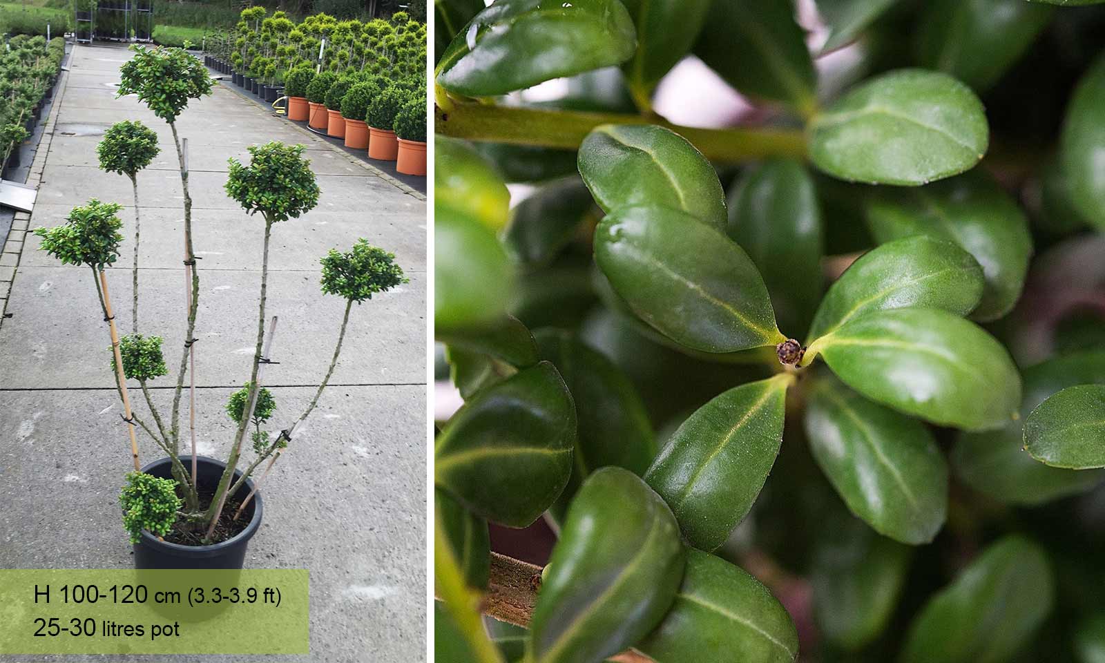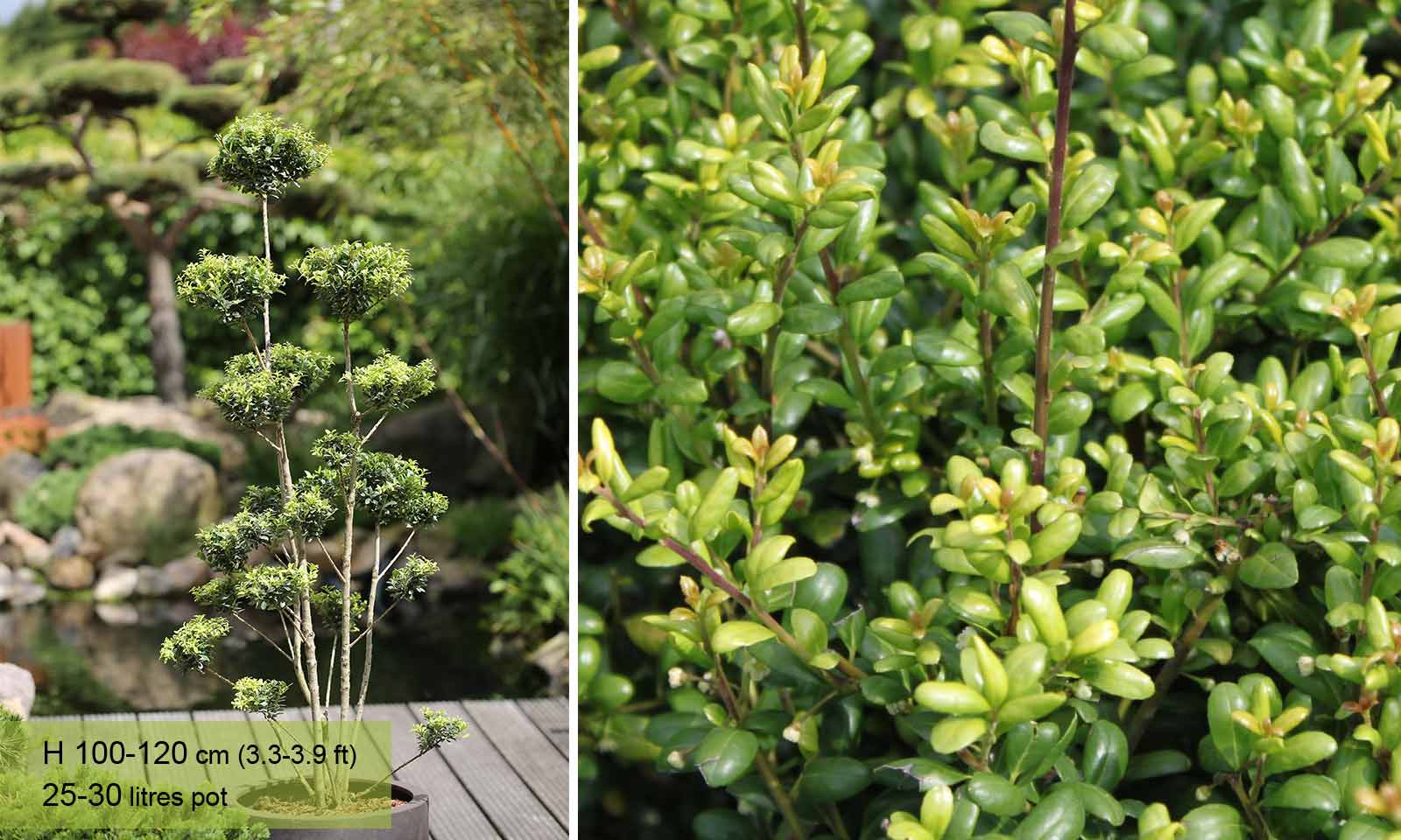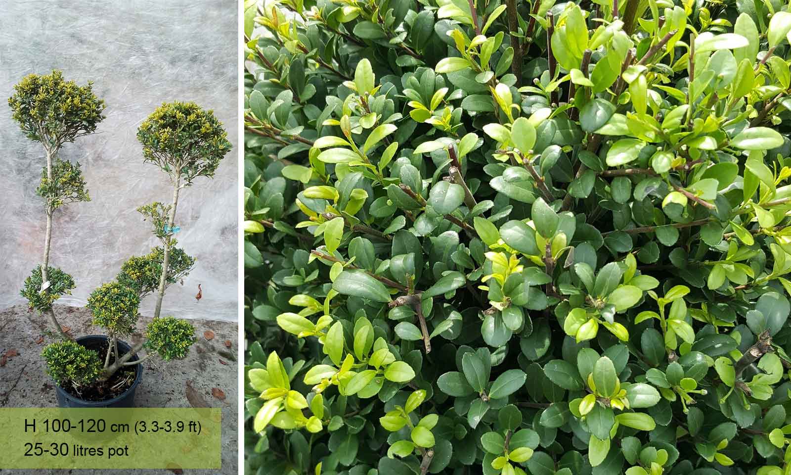 A stunning topiary Pom Pon shaped from Ilex Crenata (Japanese Holly). Ilex crenata, the Japanese Holly, is an evergreen with small glossy round leaves resembling those of Box. As the name suggests it originates from the higher parts of Japan and Korea and can live for 100 years so it is a good alternative to box, which can be killed by harsh winters. The black berries of Japanese Holly and the pale new leaves which take a couple of months to darken, create a pleasant contrast against the slightly curved darker leaves. Like all hollies Ilex Crenata has male and female plants but only the females form berries.