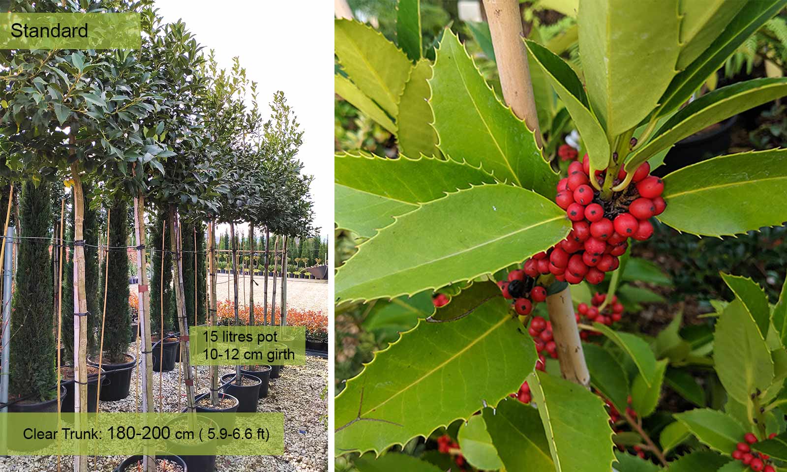 Girth 12-14 cm: 45 litres pot, trunk – 180-200 cm (5.9-6.6 ft), crown – 60-80 cm (2.0-2.6 ft);