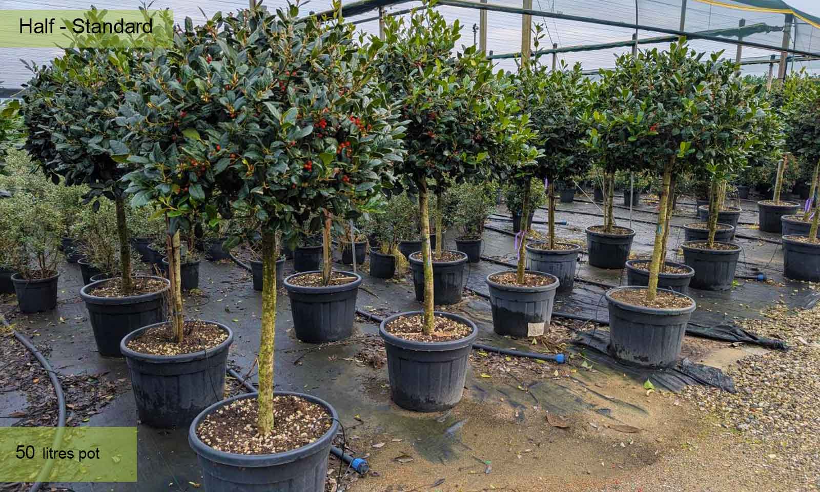 The Ilex x Nellie R.Stevens is a holly plant that is a cross between English holly ilex aquifolium and Chinese holly ilex cornuta. The plant itself with its beautiful glossy green leaves and red berries has always been traditionally seen in Europe and America as Christmas holly and used in some European countries to ward off evil spirits by hanging them above the doorway. The flowering period is April where it usually starts to blossom its small white flowers and during the Autumn-Winter period, the actual berries themselves start to form. It is a bushy plant with a fast growth speed. It does not requiring maintenance but a quick trim in the summer could help if the leaves get a bit too long. The hardiness of this plant at H6 is perfect for the British climate and only during the extreme cold do you need to shelter it. Be careful of pests and potentially the holly leaf disease with this plant. Be careful not to eat the berries, no matter how inviting they may seem, as they could cause potentially a minor stomach upset if ingested.