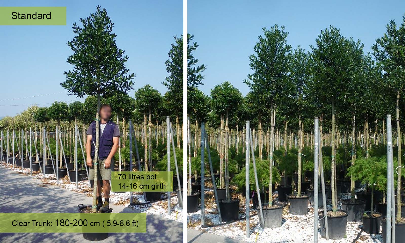 Girth 12-14 cm: 70-90 litre pot, clear trunk – 180-200 cm (5.9-6.6 ft), crown – 40-60 cm (1.3-2.0 ft);
