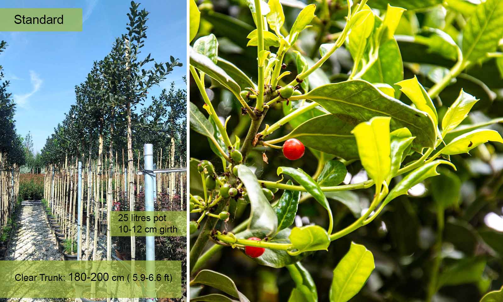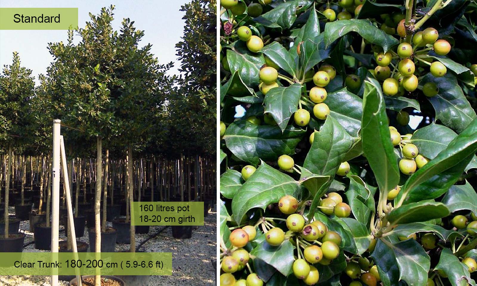Girth 20-25 cm: 230 litre pot, clear trunk – 180-200 cm (5.9-6.6 ft), crown – 60-80 cm (2.0-2.6 ft);
