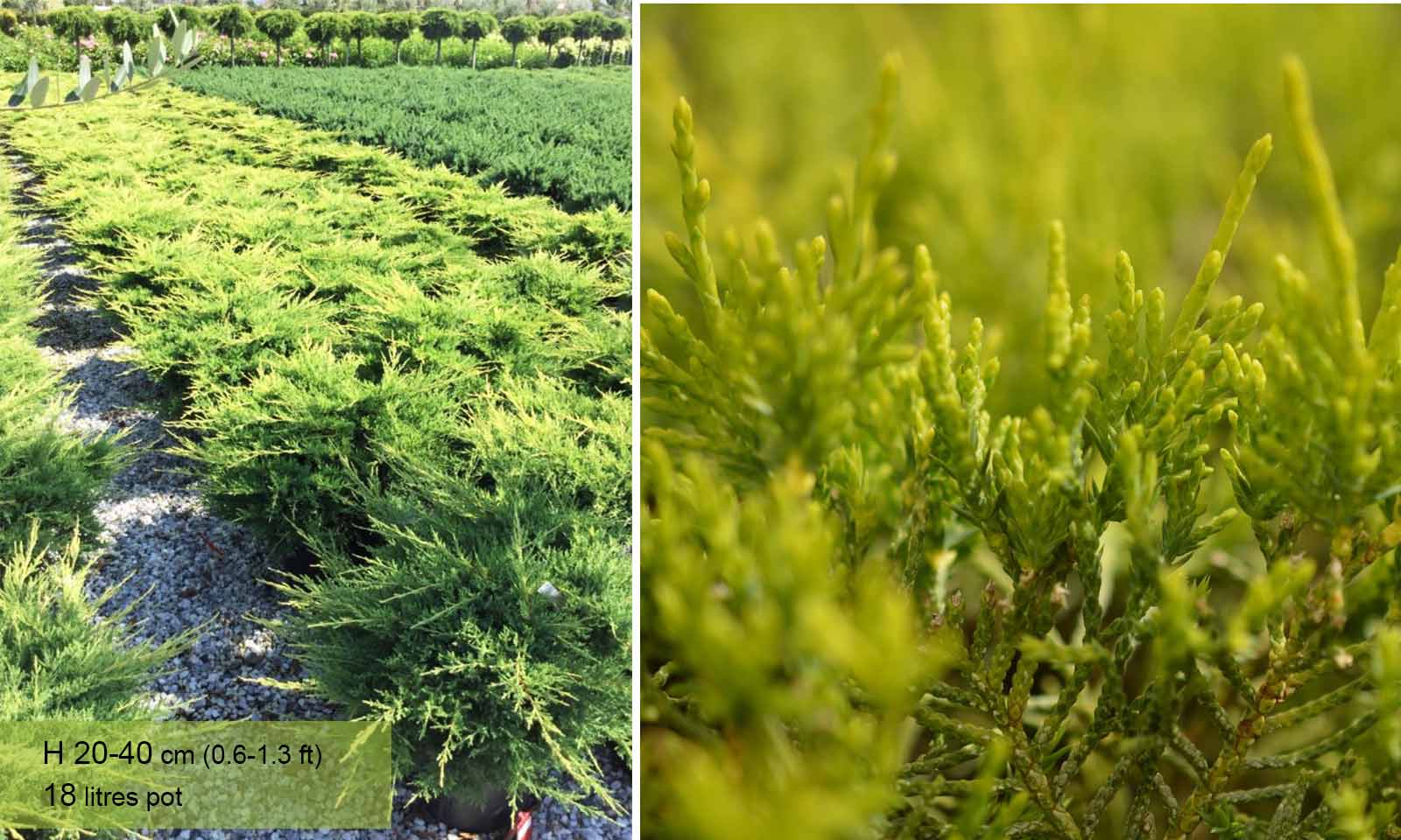 The Juniperus can be classified among the most ornamental and most useful garden conifers. They have a great variety of dimensions, forms, habits and colour of foliage, as well as excellent adaptability to the most diverse climate and soil conditions: they grow and prosper everywhere, even on chalky soil. The varieties with prostrate or semiprostrate habit most used in landscape art and as ground cover, for terraces and balconies. The varieties with erect habit great for hedges, groups and individual plantings. Juniperus ‘Gold Coast’ – beautiful ground cover conifer with yellowish-green foliage.