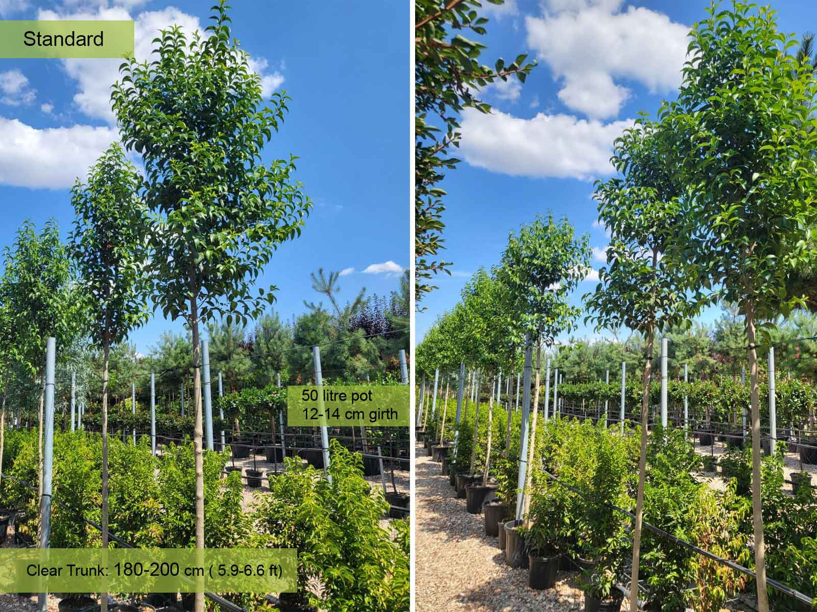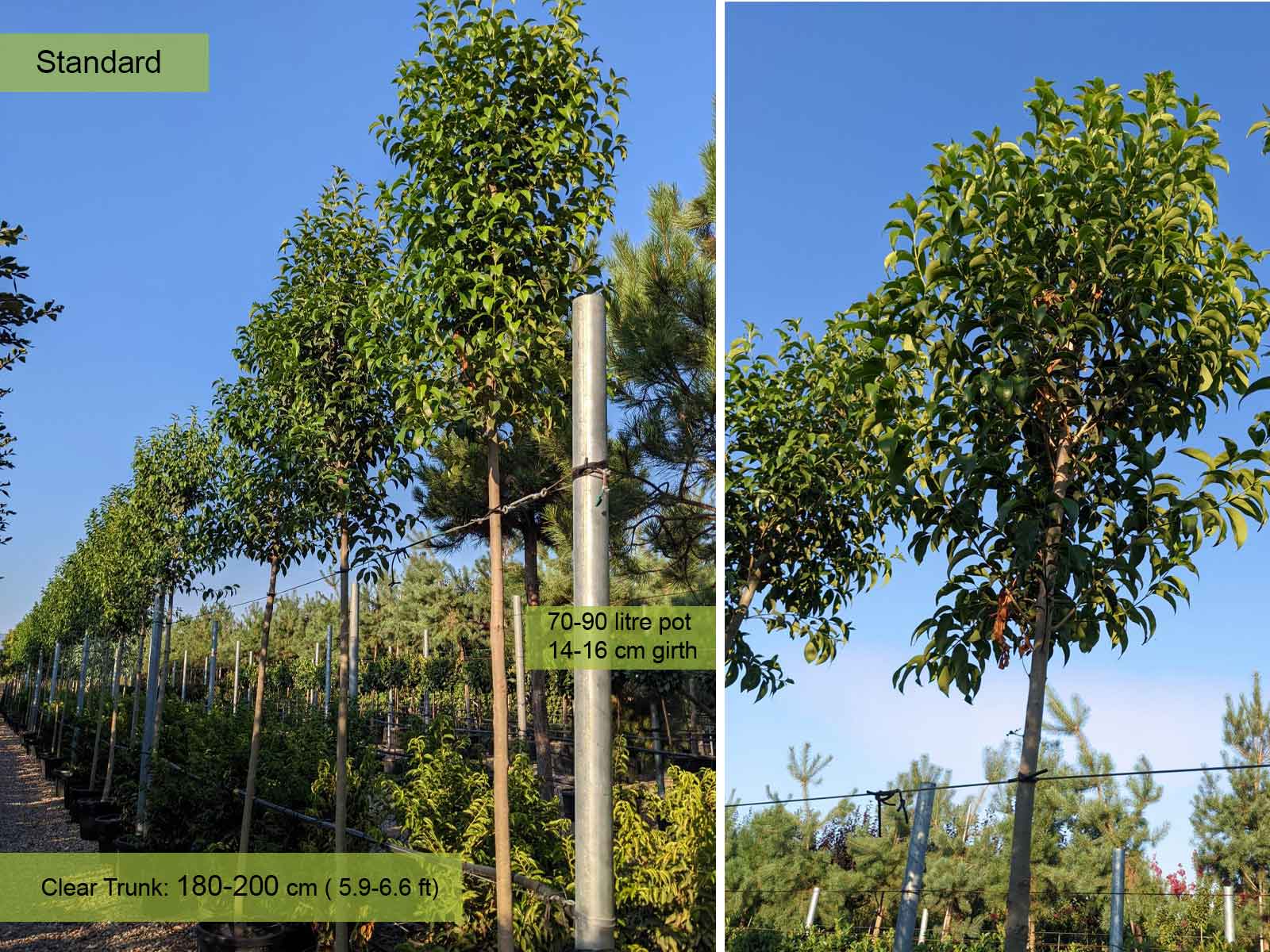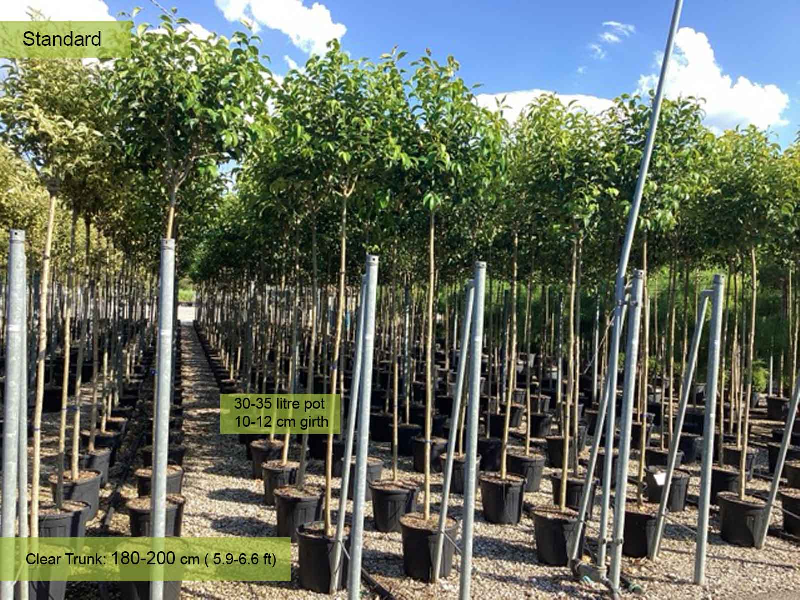 Girth 14-16 cm: 70-90 litre pot, trunk – 200 -220 cm (6.6-7.2 ft), crown – 40-80 cm (1.3-2.6 ft);