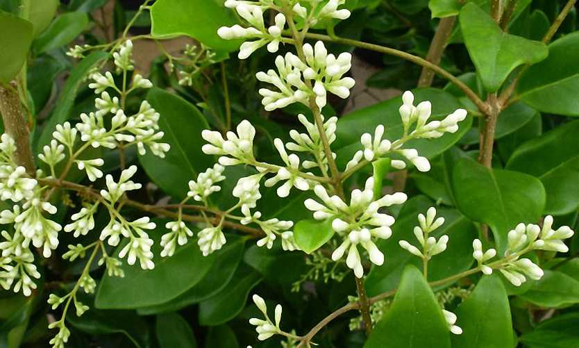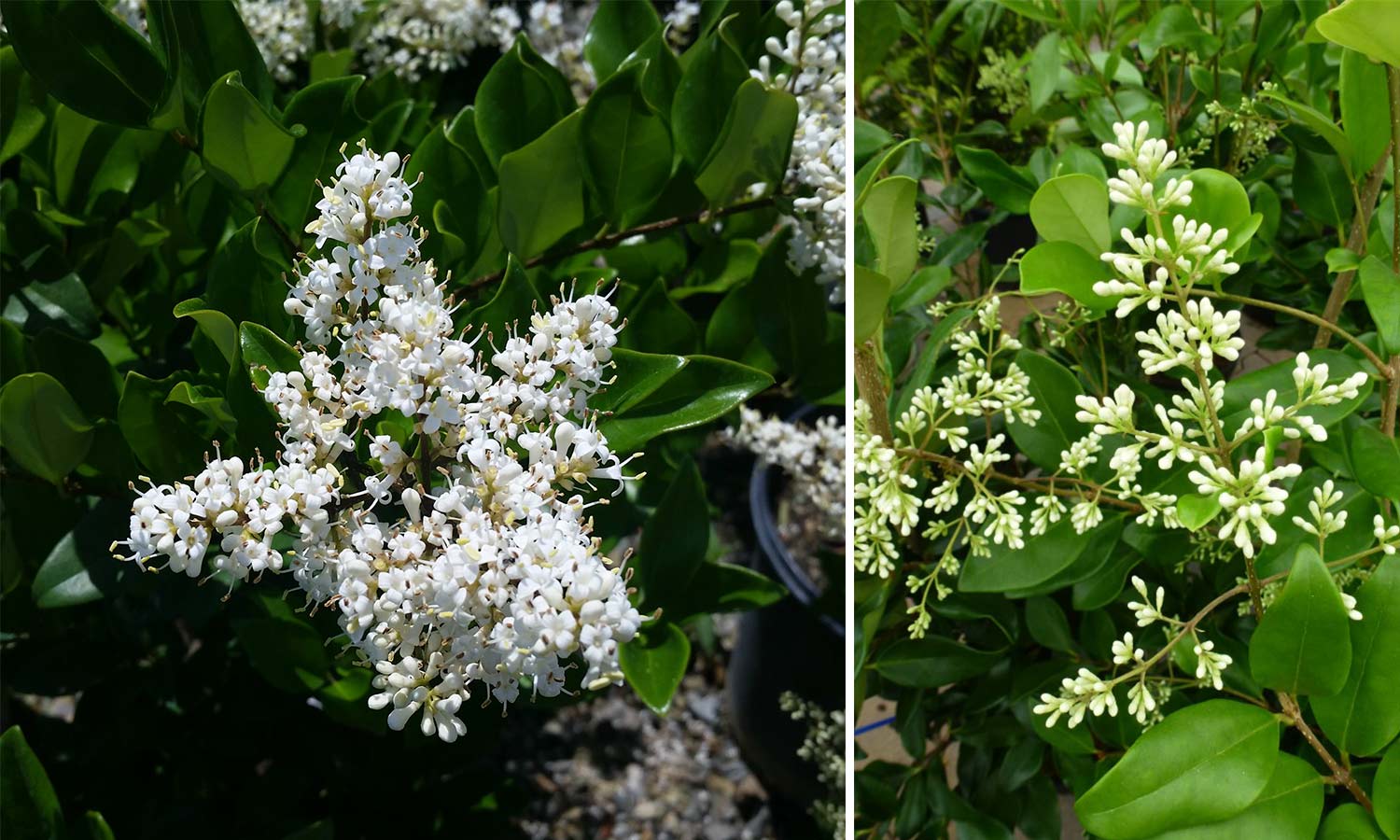 This is a lower growing variety of the species, as it only reaches 9 feet tall but is typically smaller. It is an evergreen dense, compact shrub with thick, round, waxy leaves that are glossy green above and whitish underneath. Fragrant bee-attracting white flowers bloom in late spring to early summer and then are followed by blue-black berries. Plant in sun or light shade and water regularly. It is a good hedge candidate and can be trained to nearly any shape but care should be used when pruning using shears as the cut leaves remain on the plant so it is better to be pruned and not sheared if plants are to be viewed not in the distance.