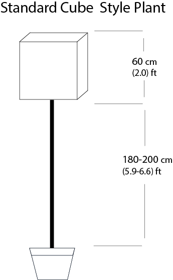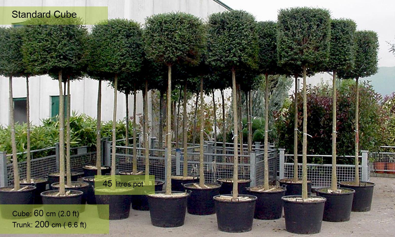 45 litre pot: trunk – 200 cm (6.6 ft), crown – 60×60 cm (2.0×2.0 ft);