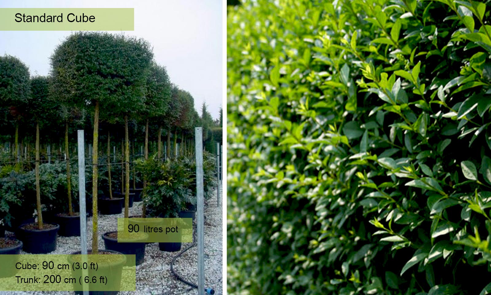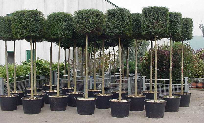 90 litre pot: trunk – 200 cm (6.6 ft), crown – 90×90 cm (3.0×3.0 ft);