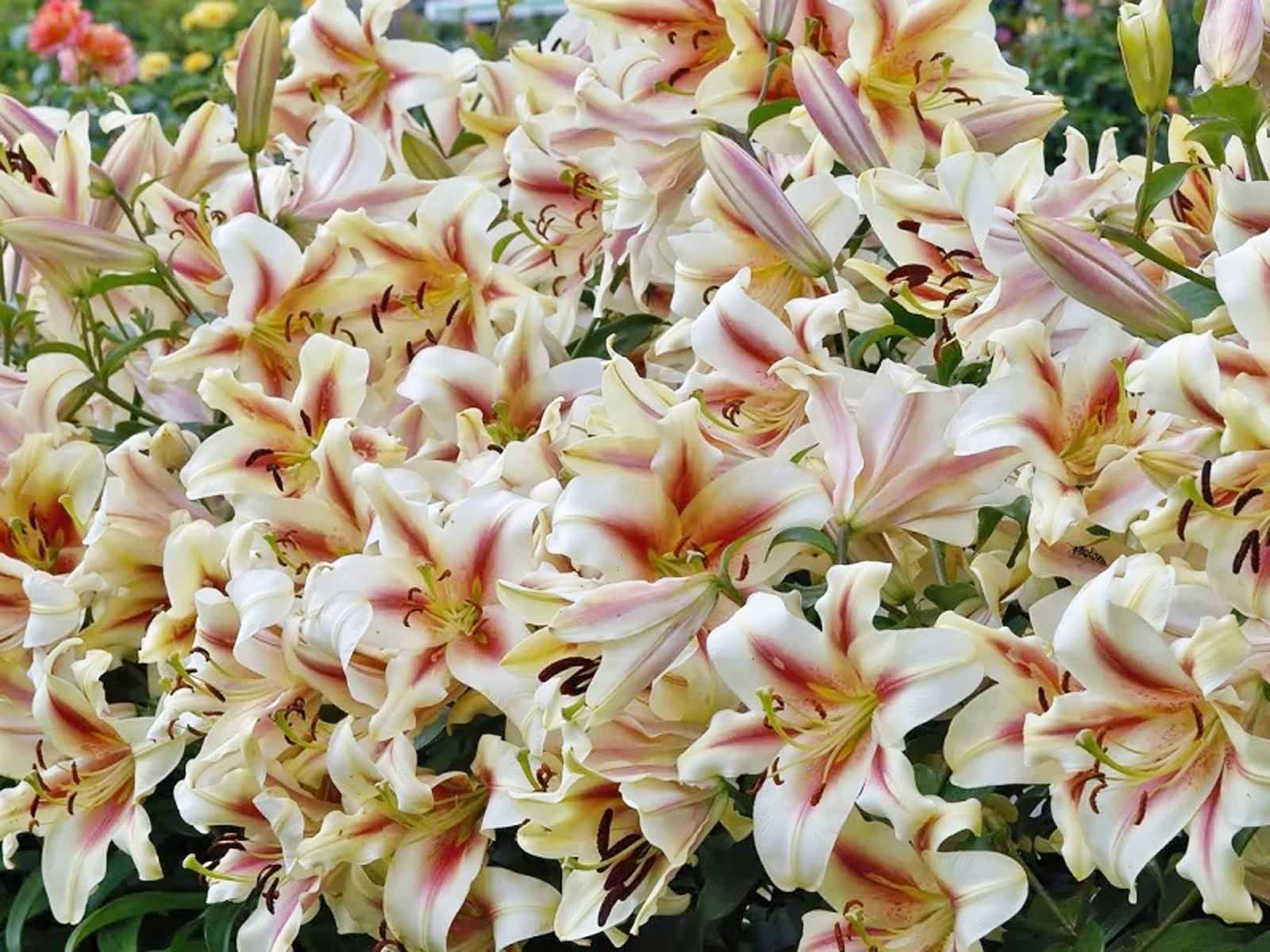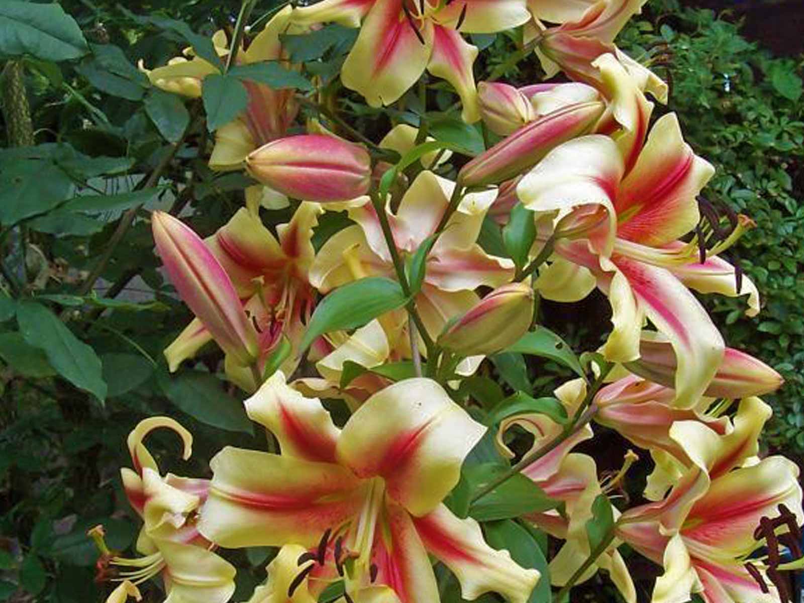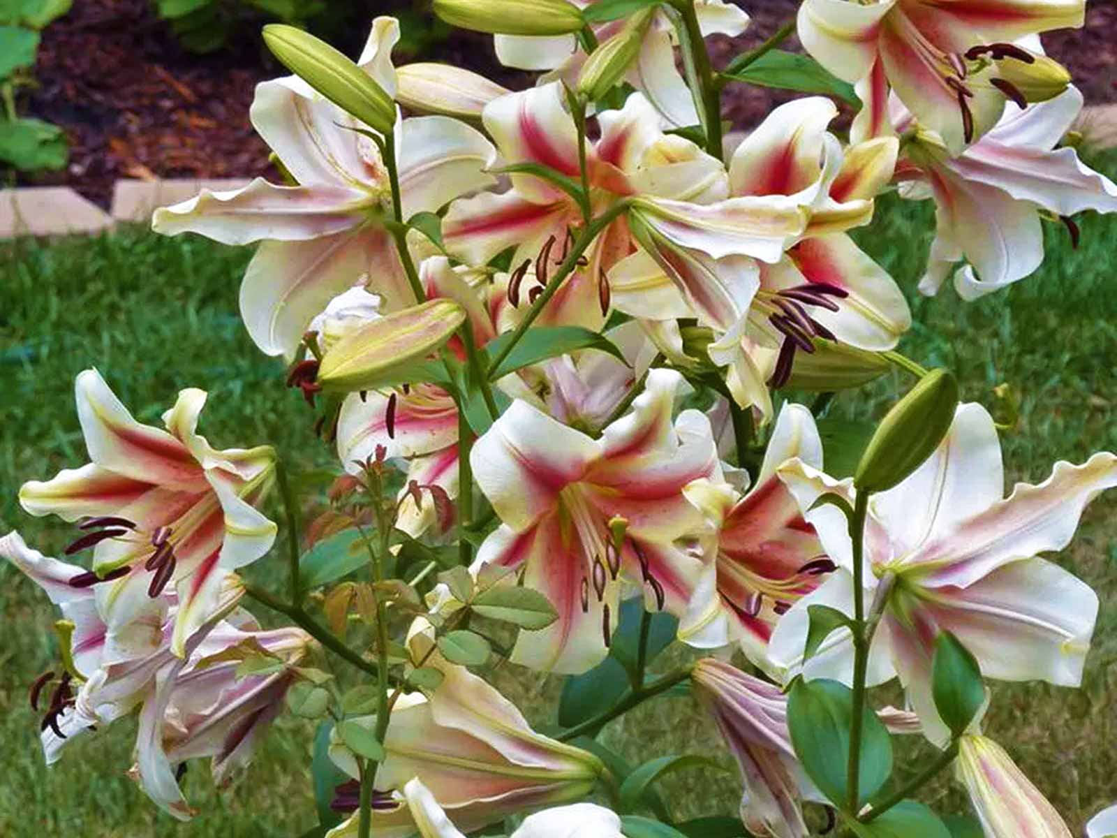Lilium ‘Lavon’ is a spectacular Oriental trumpet hybrid lily, known for its large, creamy yellow blooms with deep pink to raspberry-colored edges and a prominent golden throat. The flowers are strongly fragrant and trumpet-shaped, making them a striking focal point in borders, backgrounds, and floral arrangements. Its bold coloration and scent make it a favorite for midsummer displays.