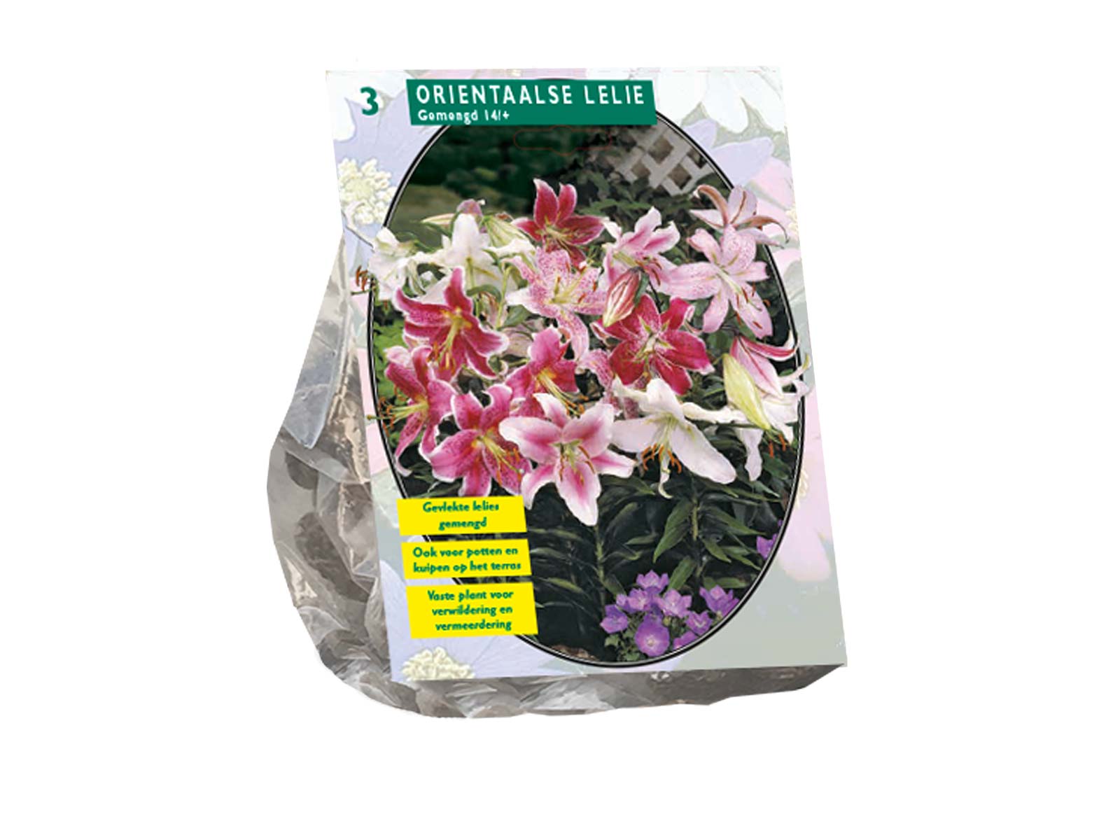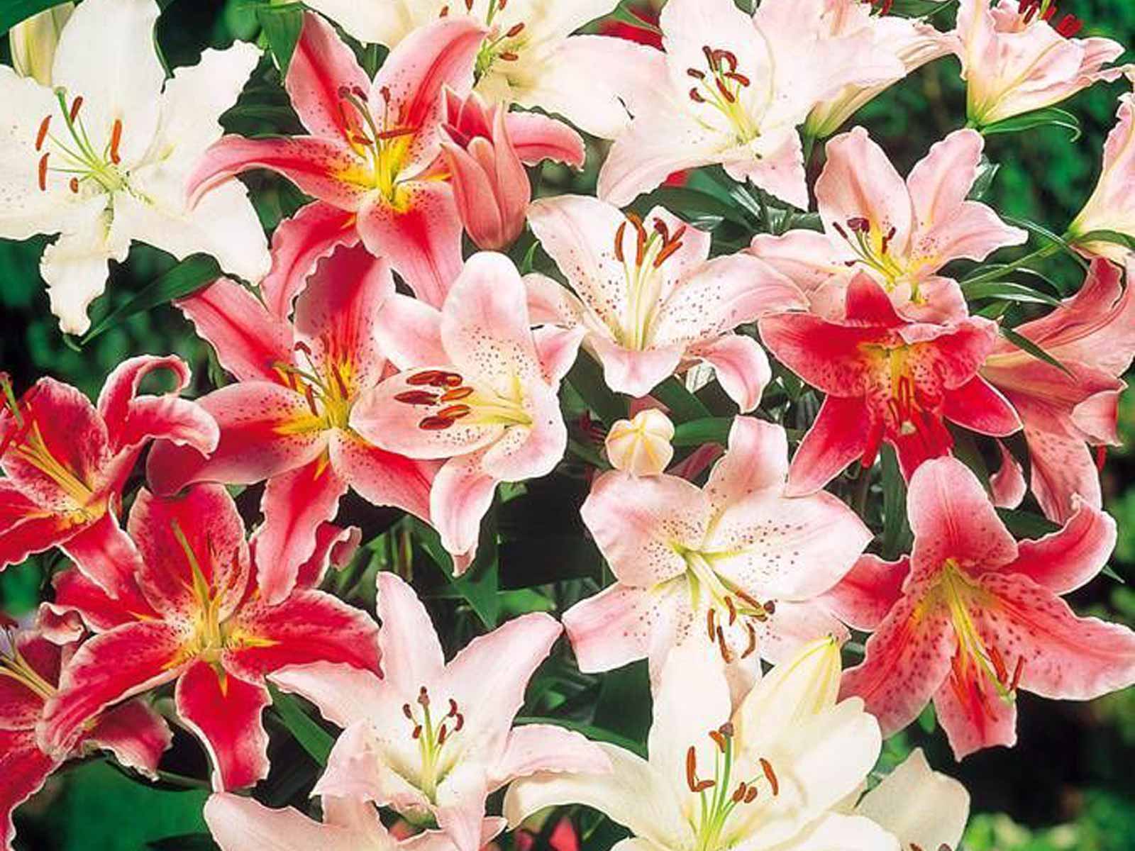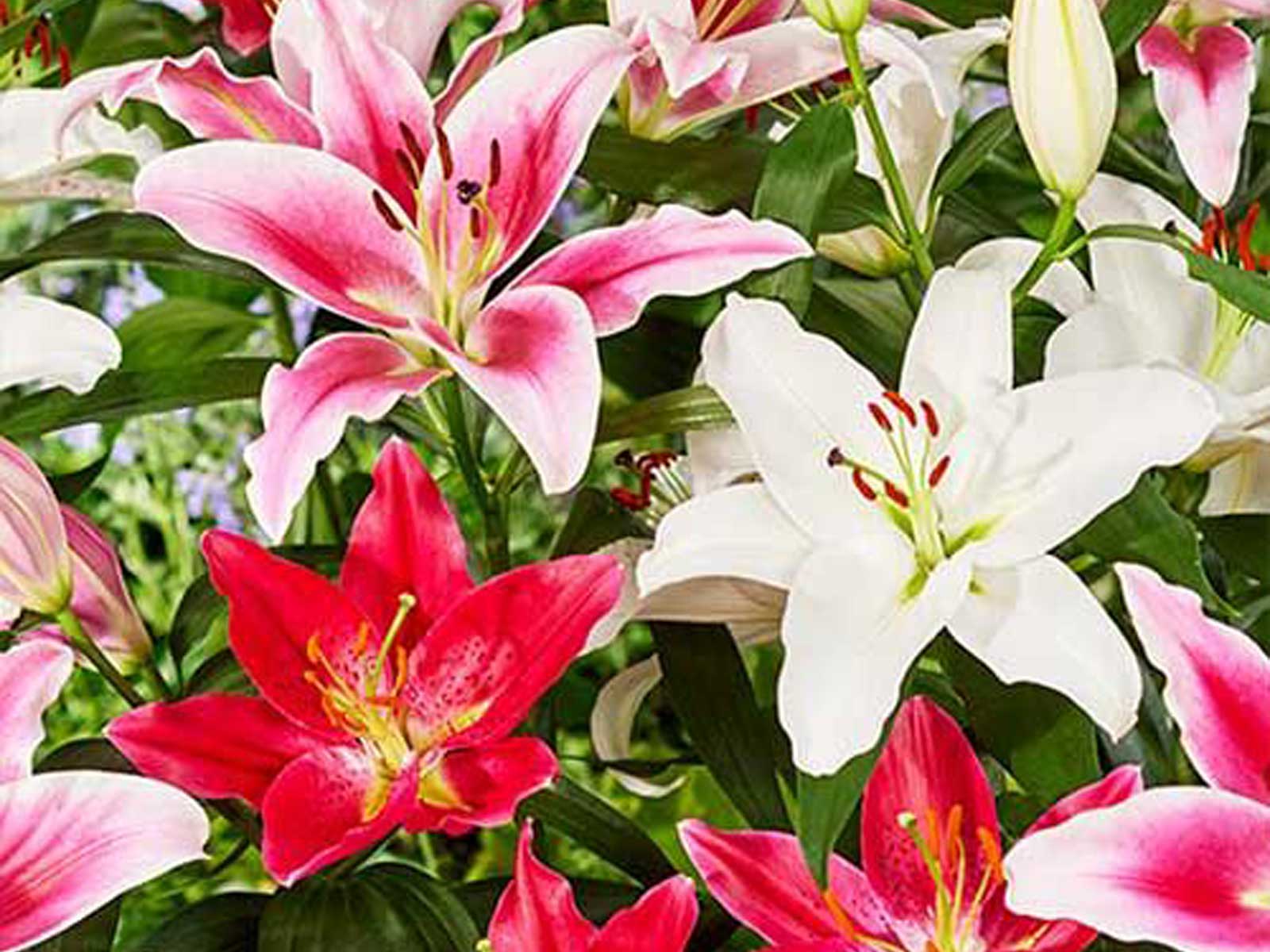 Lilium ‘Oriental’ Mix is a luxurious blend of Oriental lilies, known for their large, star-shaped blooms and rich fragrance. This mix includes a variety of colors—typically pinks, whites, and reds—often with striking spots or contrasting edges. These lilies add elegance and dramatic height to borders, beds, and floral arrangements.