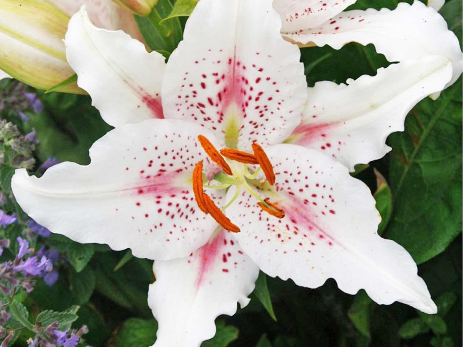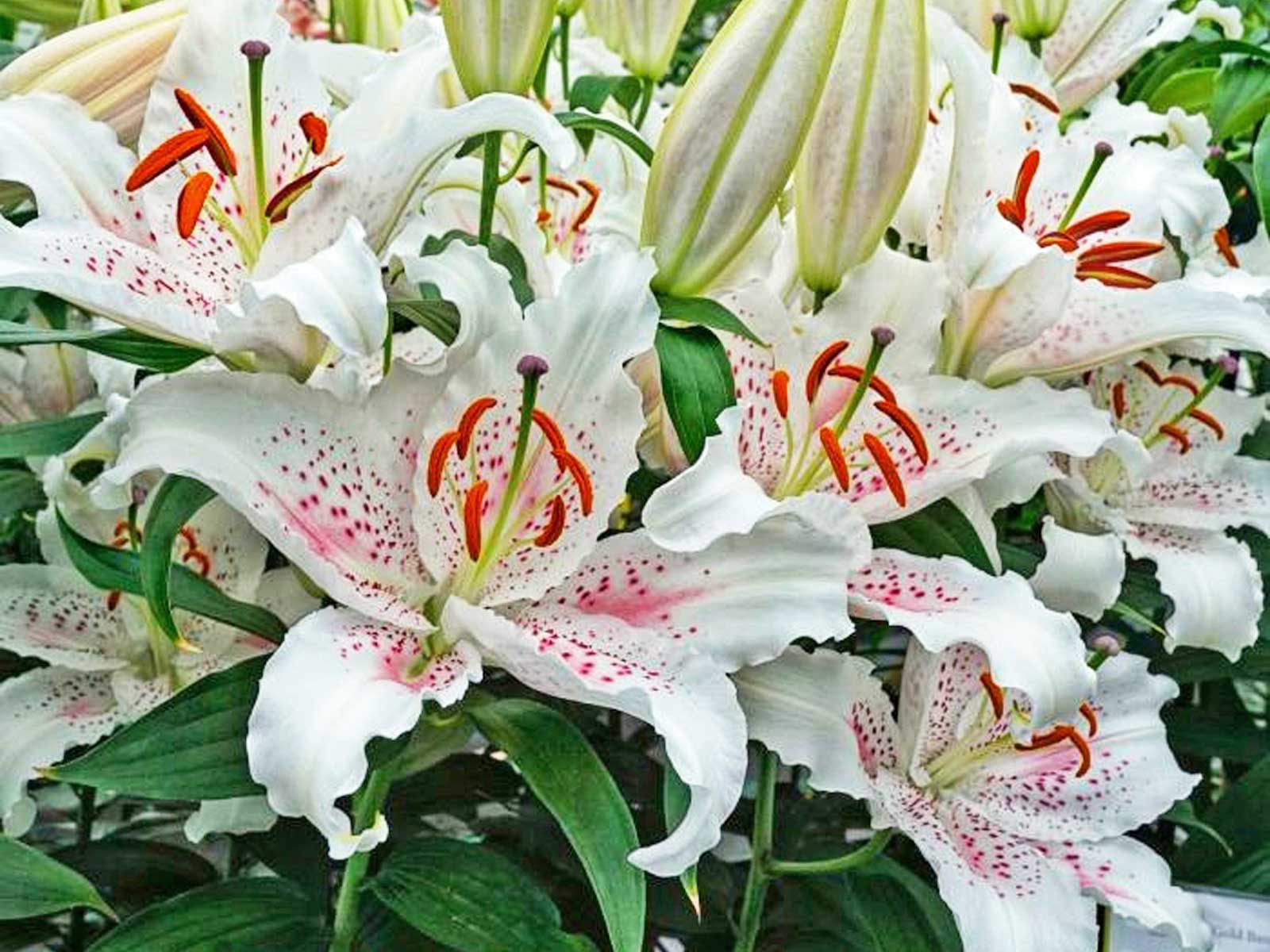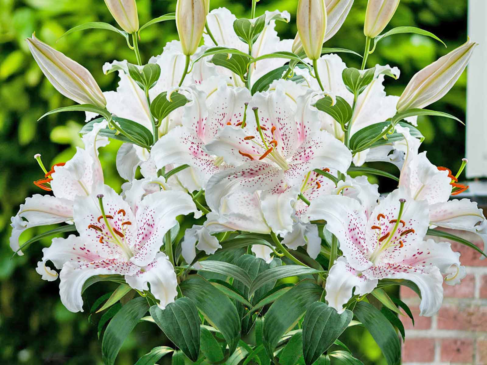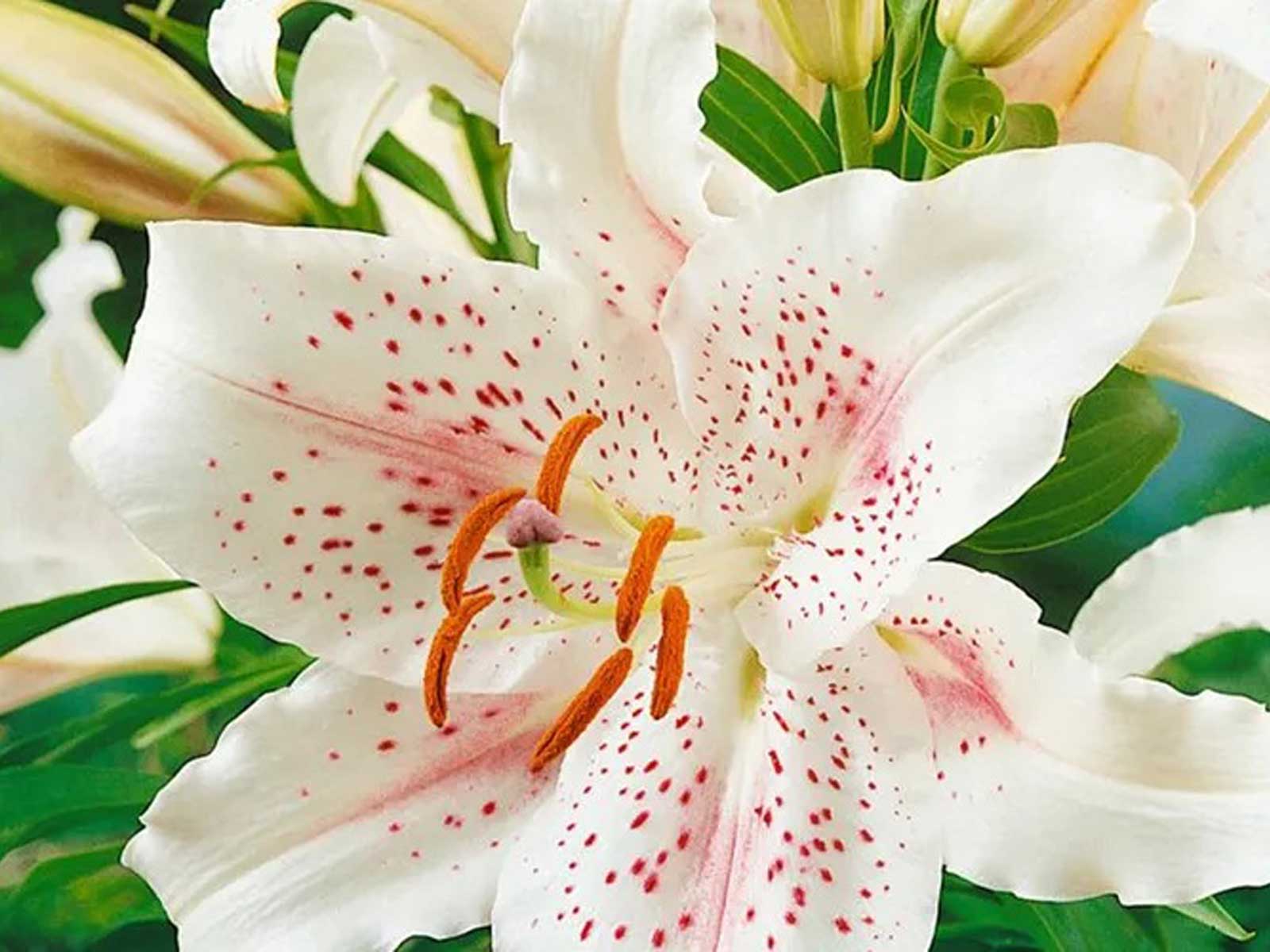 Lilium ‘Oriental Muscadet’ is a beautifully refined Oriental lily variety, featuring large, white, star-shaped blooms with soft pink speckles and a delicate blush at the center. The gently ruffled petals and sweet fragrance make it a favorite for borders, containers, and especially cut flower arrangements. Its elegant appearance adds a touch of romance and sophistication to any summer garden.