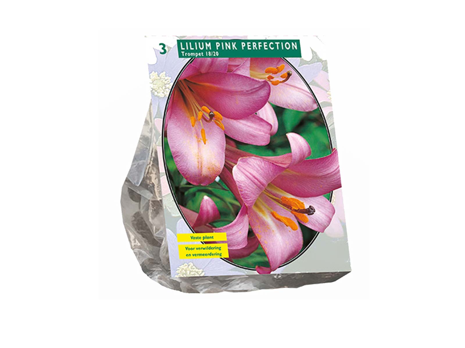 Lilium ‘Pink Perfection’ is a tall and elegant trumpet lily, known for its stunning deep rose to magenta-pink blooms with a soft sheen and slightly recurved petals. The large, trumpet-shaped flowers are richly fragrant and make a dramatic statement in borders, backdrops, and floral arrangements. Its classic form and sweet scent make it a standout in any summer garden.