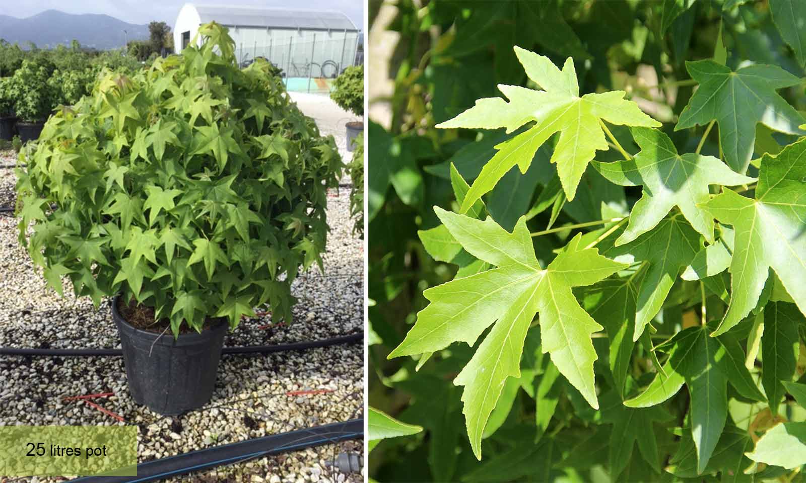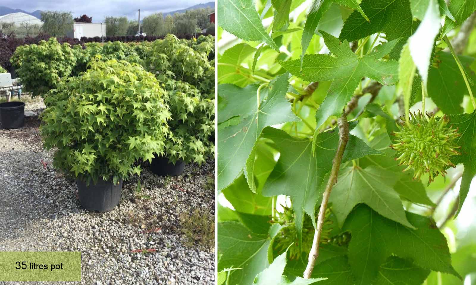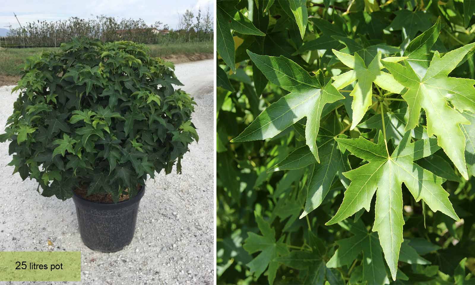 Topiary clipped from Liquidambar Styraciflua – one of the most elegant deciduous trees with a straight trunk covered in well-spaced branches forming a regular shaped pyramid which with age becomes rounded. The bark, green in the first year and then grey cracks and becomes corky with ribs that gradually get deeper. Leaves: borne on long stalks which look like the maple leaf, with 5 acuminate lobes, slightly toothed, bright green from spring until autumn when they turn the most beautiful colours, from golden yellow, orange, bright red to purple. Flowers: form at the same time as the leaves, not very showy, neither the male ones (yellowish, round, grouped in racemes), nor the female ones which are grouped in short inflorescences. Fruit: hanging, round, initially green and then brown when ripe, resembles fruit of plane trees but smaller. Loves deep, moist, but not marshy, soil. Adapts to other types of soil provided not too dry and very calcareous. Use: planted singly or in groups of three, or together with other trees with colourful foliage as a street plant. It can also be planted in small gardens, as its growth can be contained by pruning which it withstands extremely well.