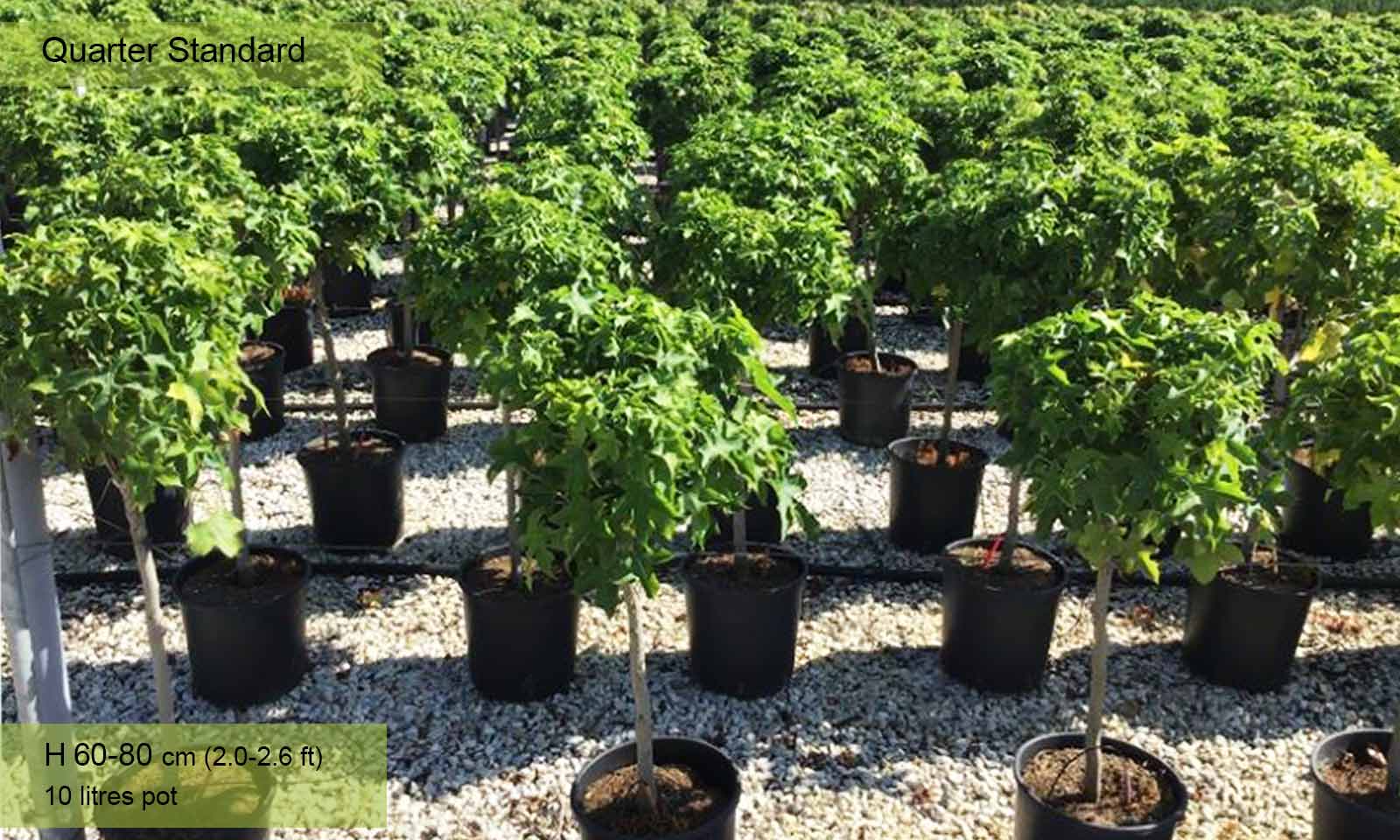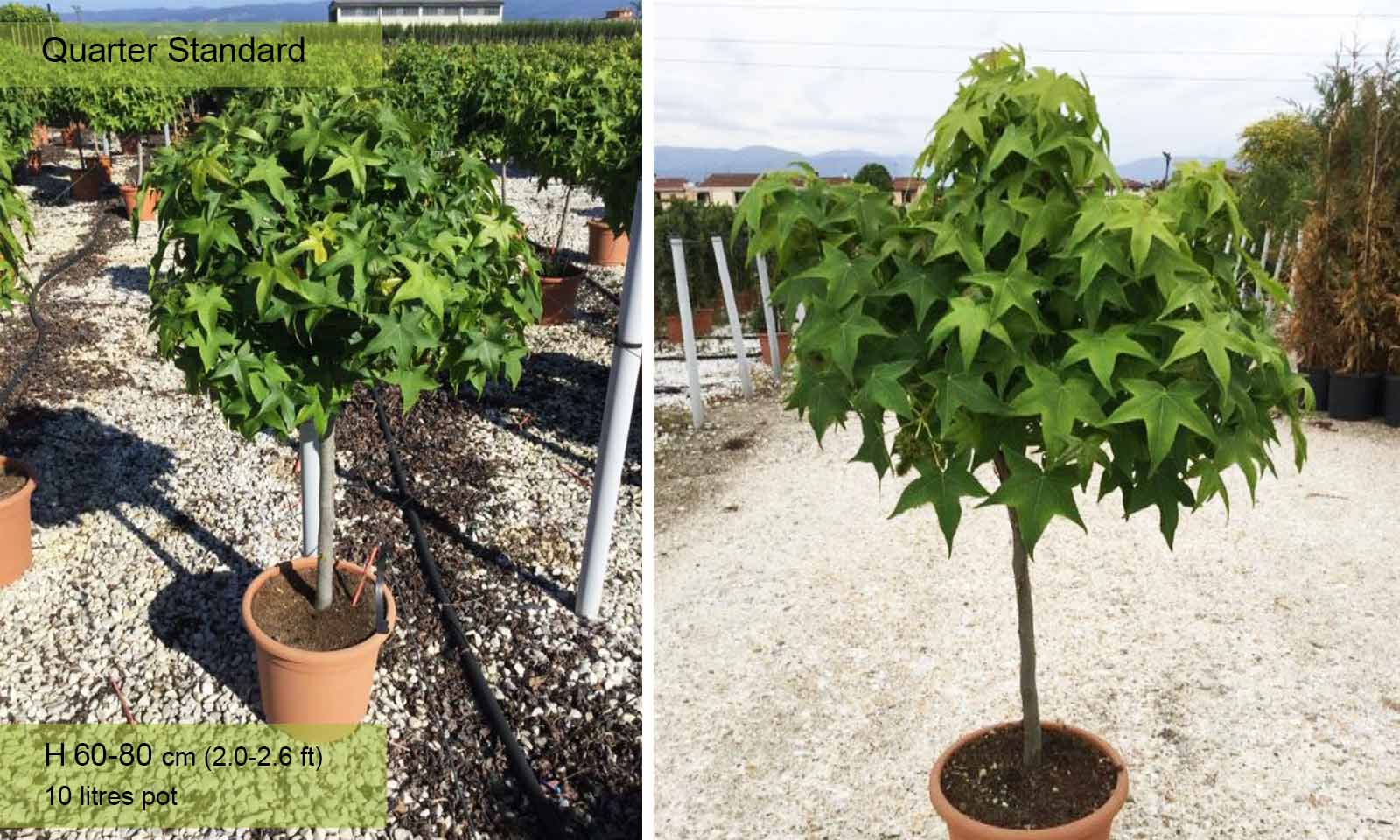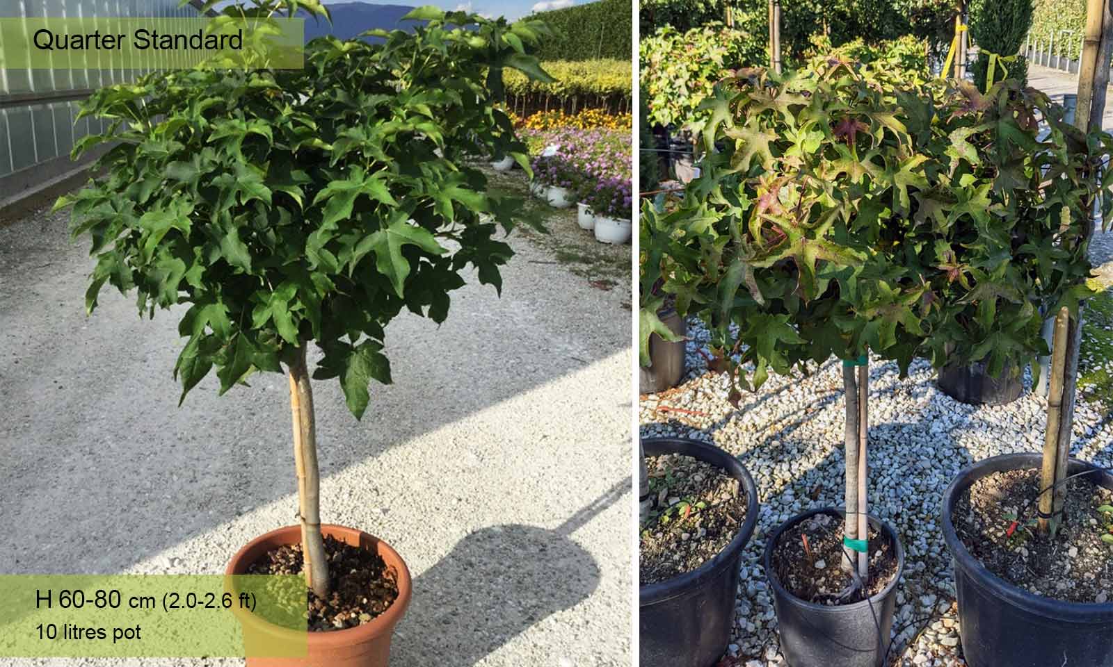 One of the most elegant deciduous trees with a straight trunk covered in well-spaced branches forming a regular shaped pyramid which with age becomes rounded. It can easily be trained into a tree with a clear stem topped with a own that is initially pyramidal and then globular. The bark, green in the first year and then grey cracks and becomes corky with ribs that gradually get deeper. Leaves: borne on long stalks which look like the maple leaf, with 5 acuminate lobes, slightly toothed, bright green from spring until autumn when they turn the most beautiful colours, from golden yellow, orange, bright red to purple. Flowers: form at the same time as the leaves, not very showy, neither the male ones (yellowish, round, grouped in racemes), nor the female ones which are grouped in short inflorescences. Fruit: hanging, round, initially green and then brown when ripe, resembles fruit of plane trees but smaller. Loves deep, moist, but not marshy, soil. Adapts to other types of soil provided not too dry and very calcareous. Use: planted singly or in groups of three, or together with other trees with colourful foliage as a street plant. It can also be planted in small gardens, as its growth can be contained by pruning which it withstands extremely well.