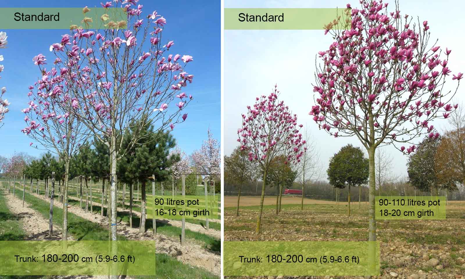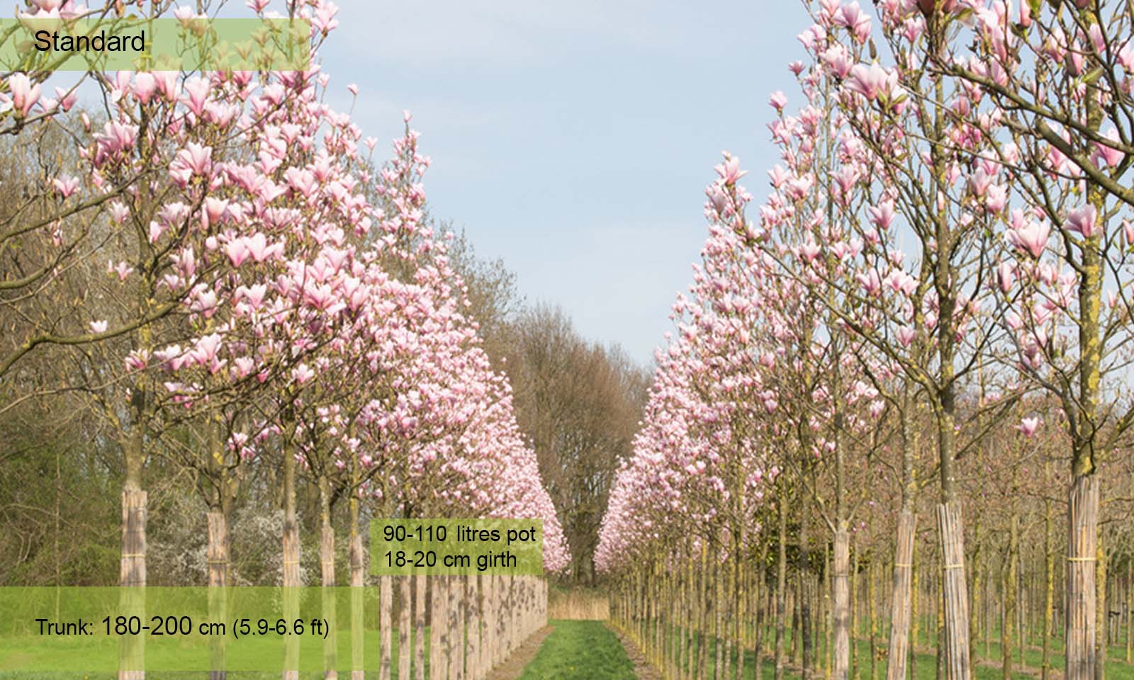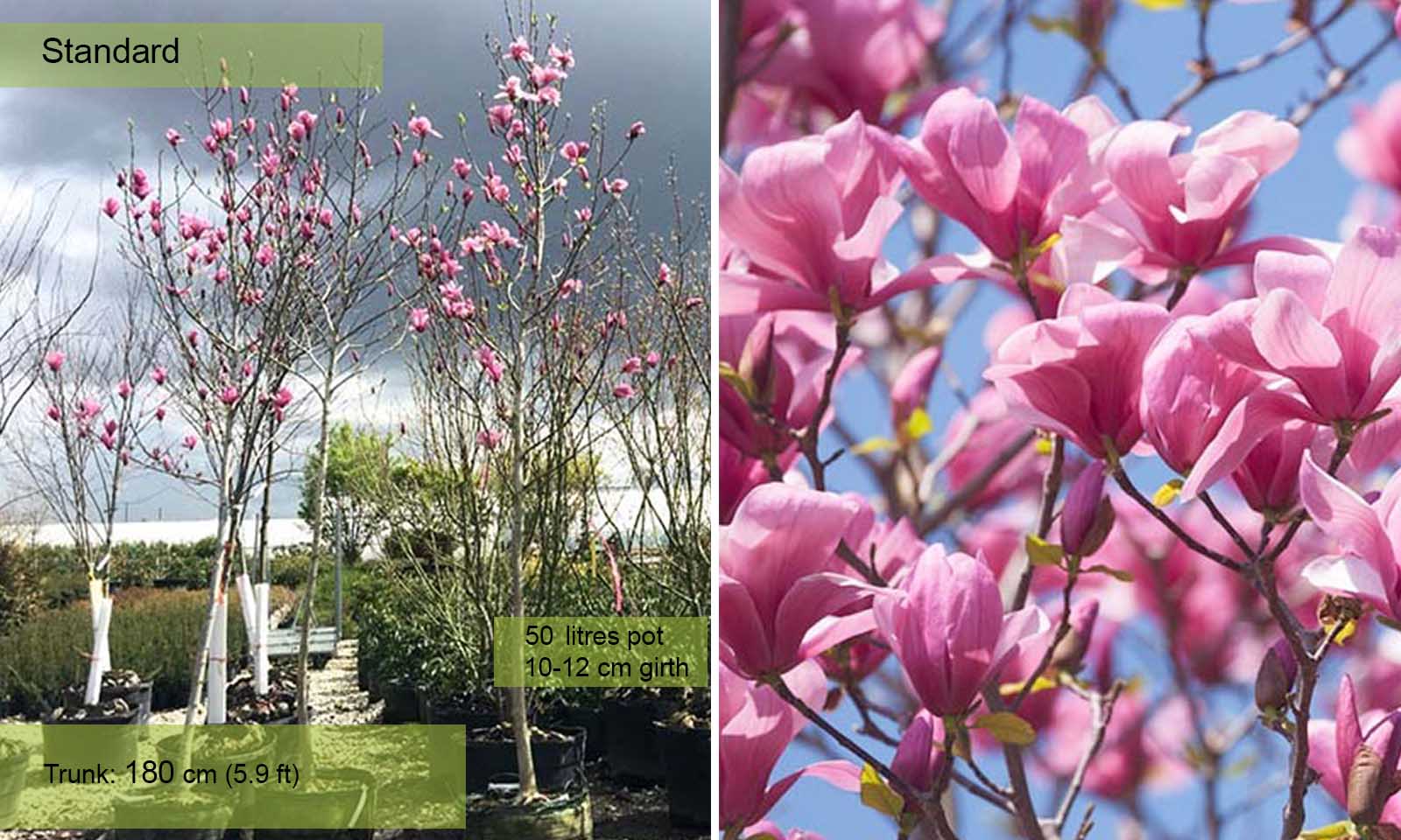 The name Magnolia first appeared in 1703 in the Genera of Charles Plumier, for a flowering tree that he found on the island of Martinique, although the plant itself is an ancient genus, encompassing about 210 different species. This particular plant, the Galaxy, is in standard format and is very hardy standing at H6, perfect for the British climate. It only needs sheltering in extreme conditions. Follow the maintenance guide on how to prune Magnolia. It is prone to diseases and pests so take that into consideration.