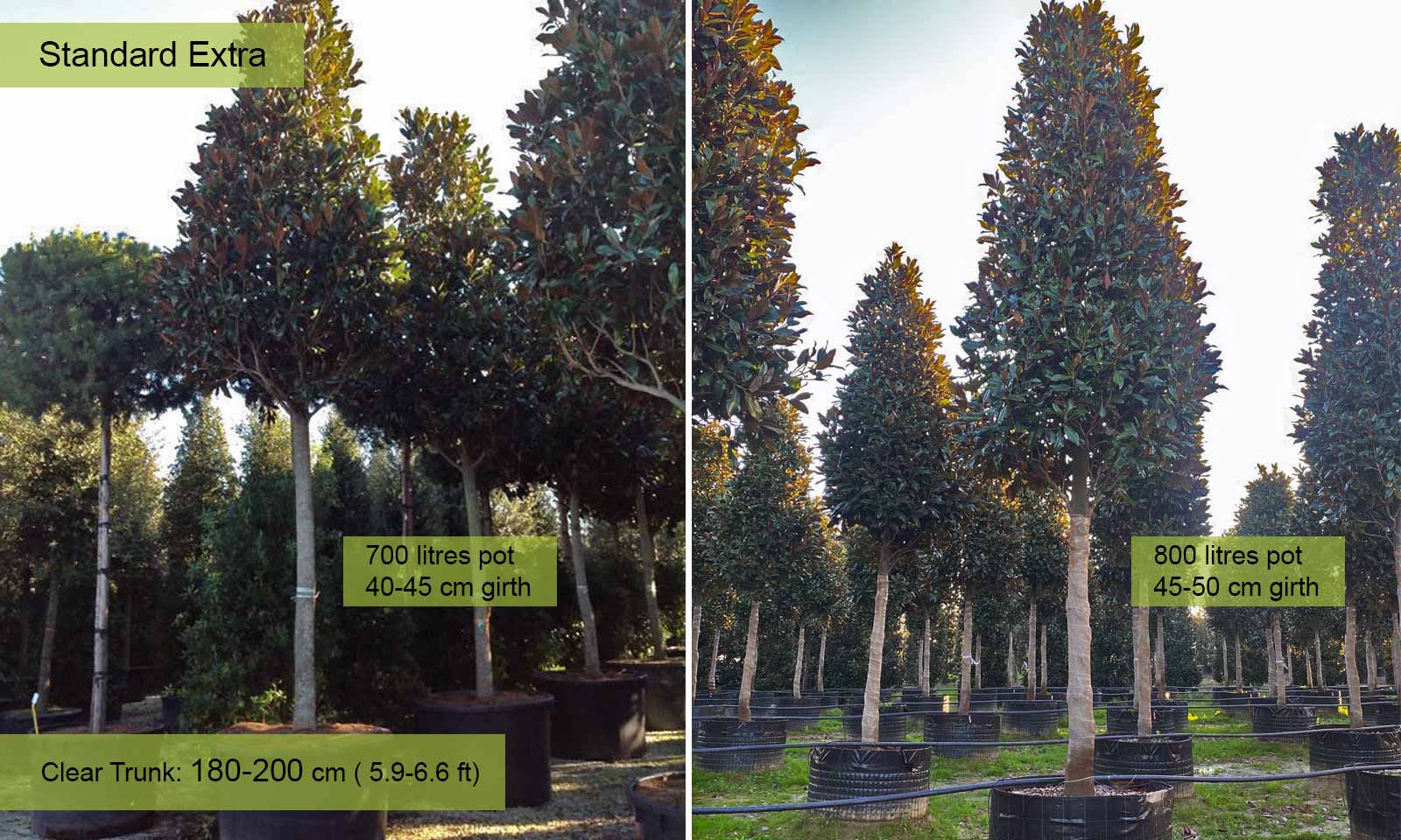 Girth 40-45 cm: 900-1200 litre pot, clear trunk – 180-200 cm (5.9-6.6 ft), crown – 200-250 cm (6.6-8.2 ft);