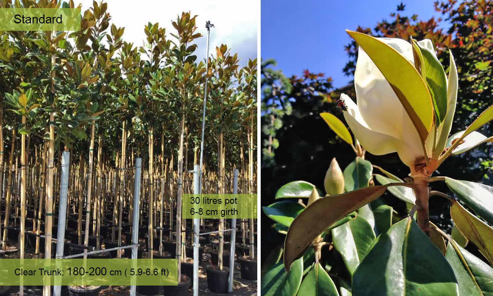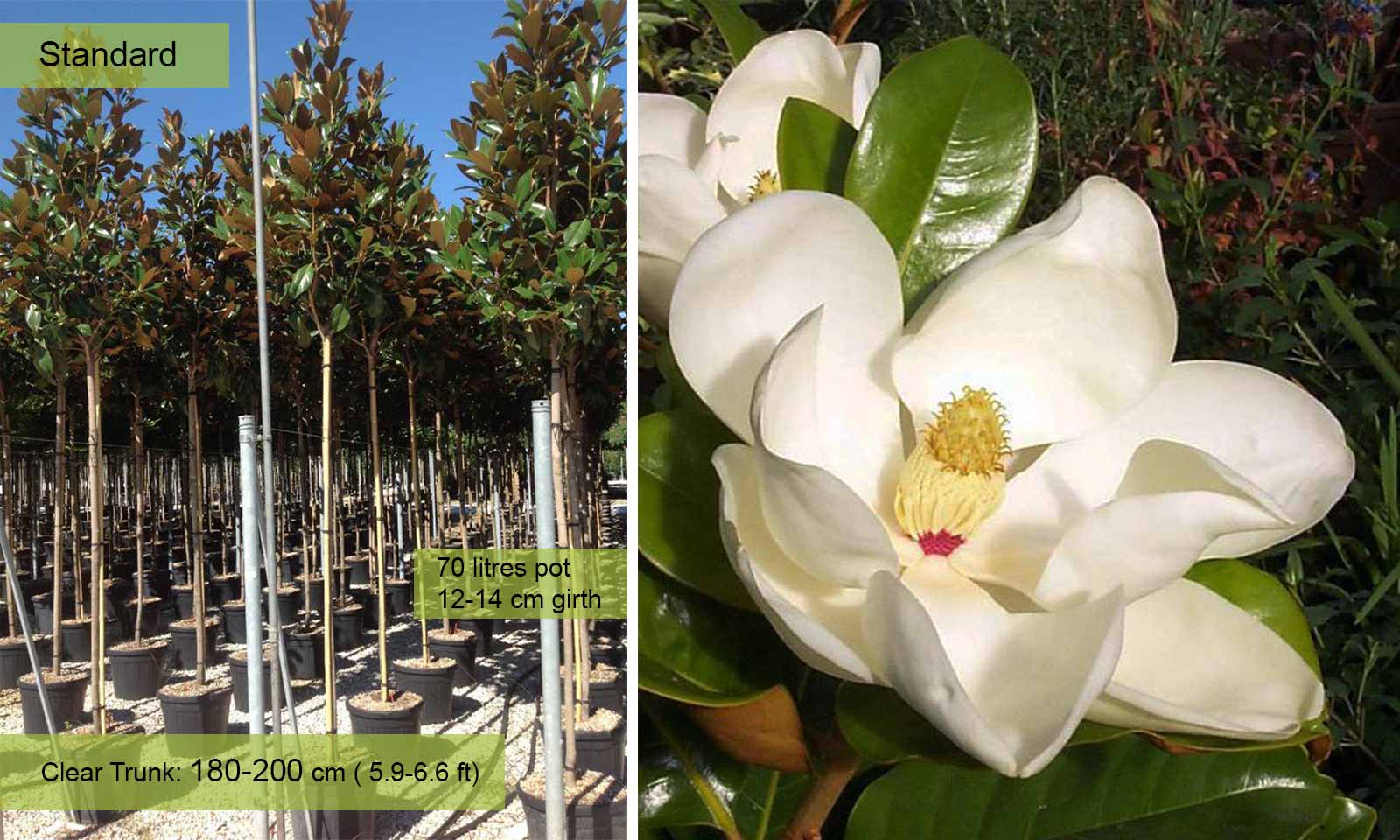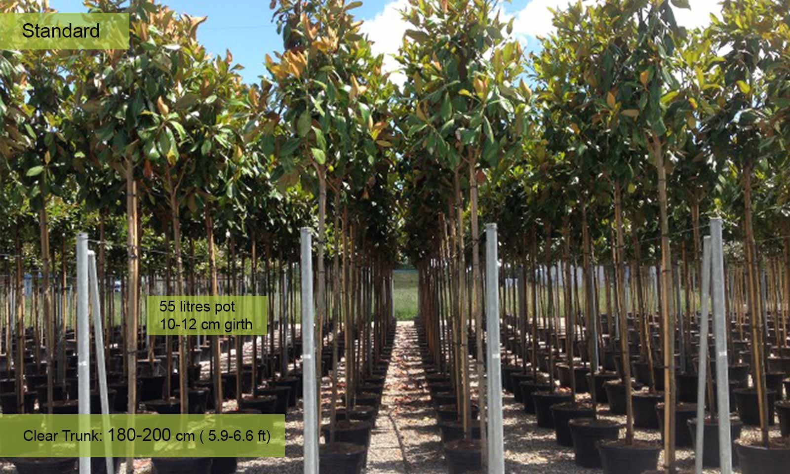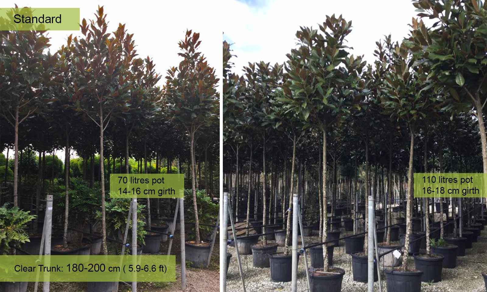 Girth 14-16 cm: 70-90 litre pot, clear trunk – 180-200 cm (5.9-6.6 ft), crown – 60-90 cm (2.0-2.9 ft);
