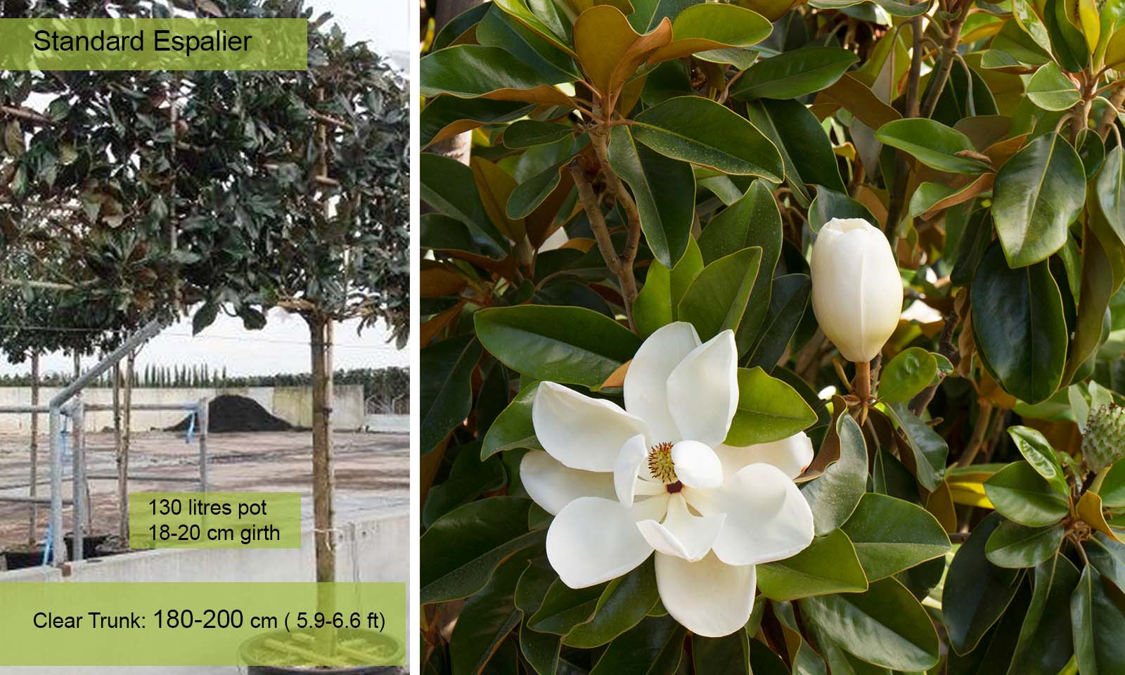 Girth 20-25 cm: 130 litre pot, Trunk – 200 cm (6.6 ft), Trellis – W140 x H120 cm (4.6 x 3.9 ft);