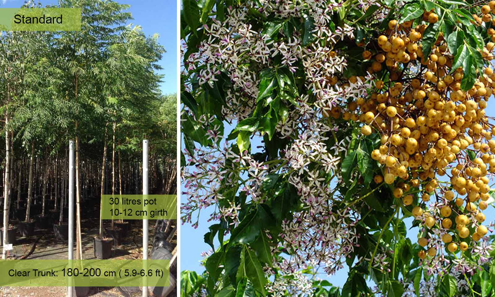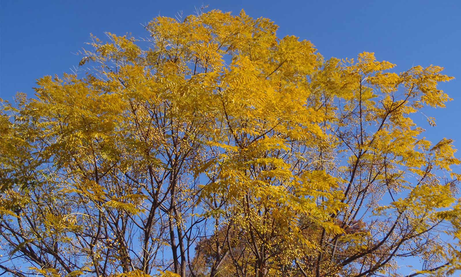 Deciduous tree which is greatly appreciated for its elegant foliage, beautiful flowers and long lasting, ornamental fruit. Bright green, pinnate leaves made up of oval-lanceolate leaflets, 3-5 cm; lovely golden yellow autumn colouring. Fragrant, mauve, star- shaped flowers in 10-20 cm panicles. Round, yellow fruit follow; the fruits last until spring making the tree very decorative in winter. No particular requirements as regards the soil provided it is well drained.