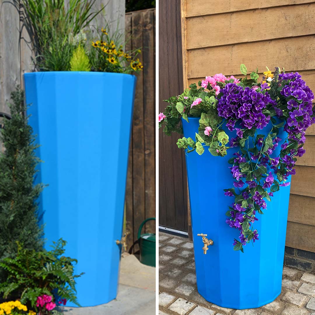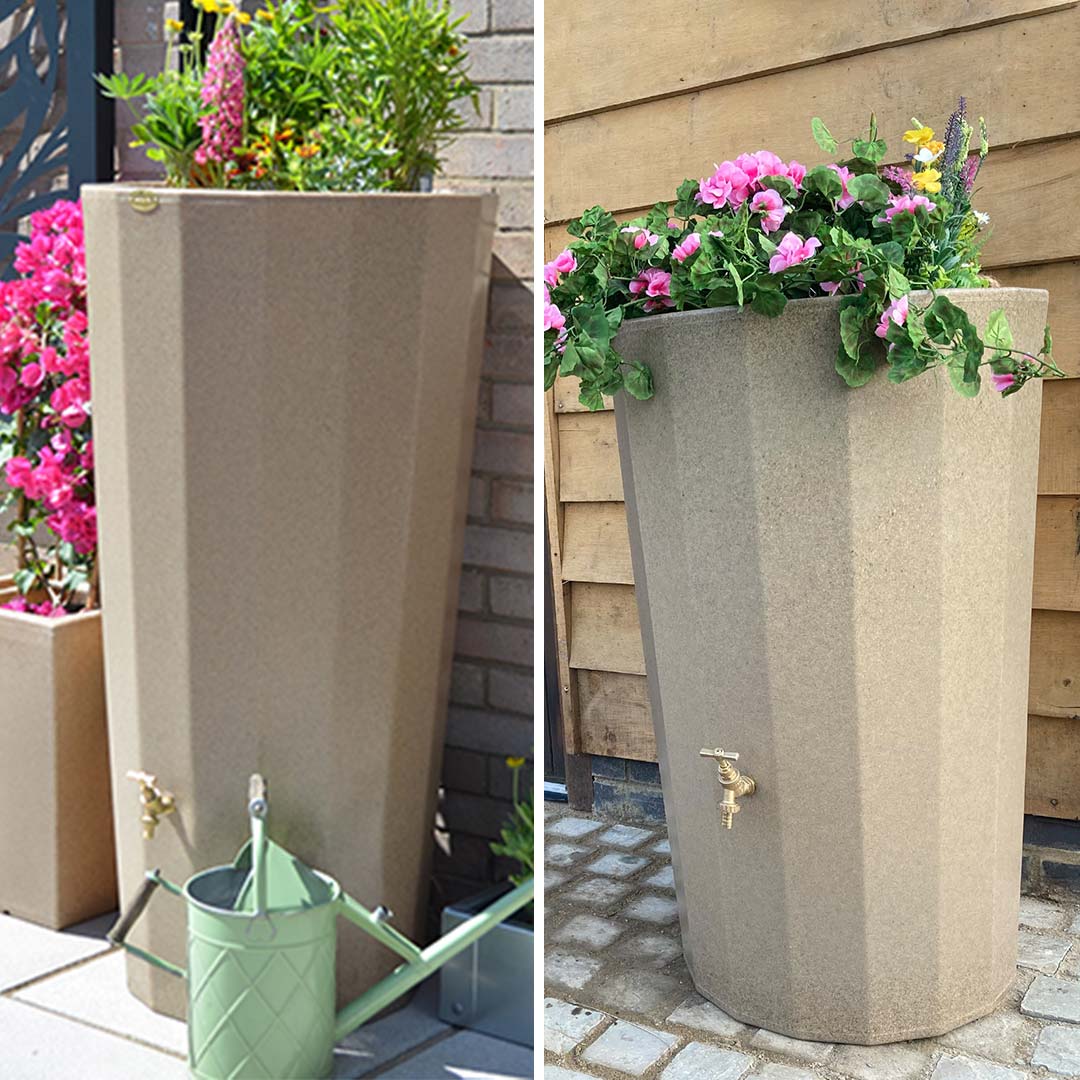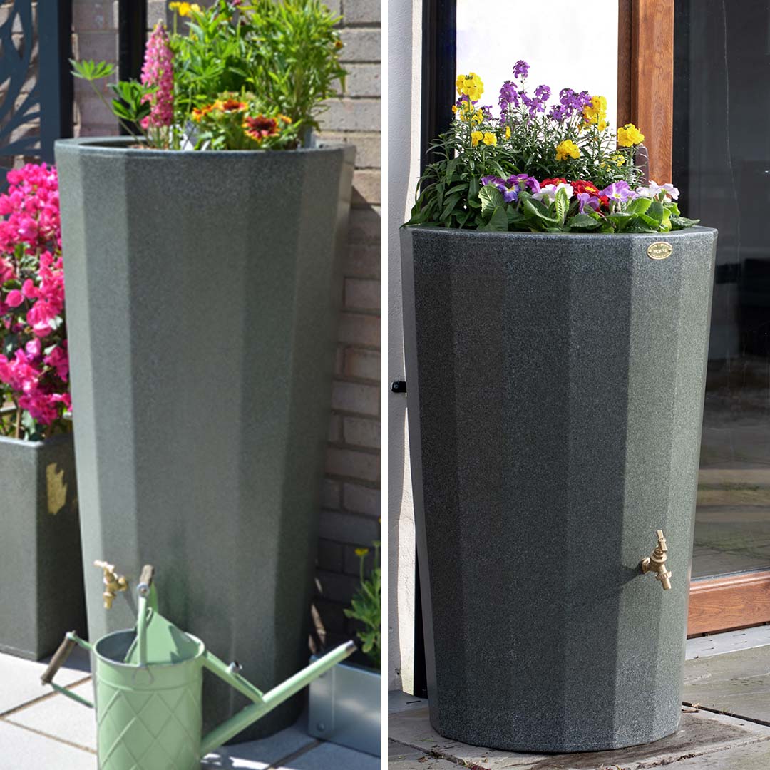 - Stylish, dual-purpose water butt and planter