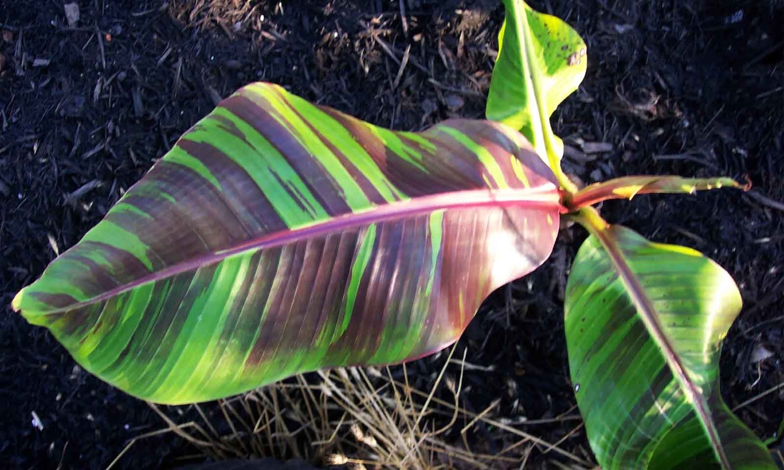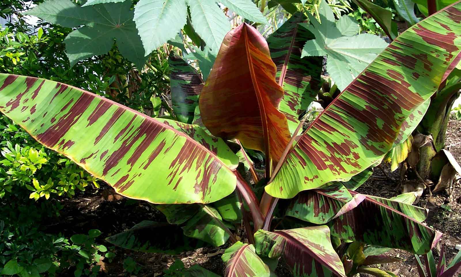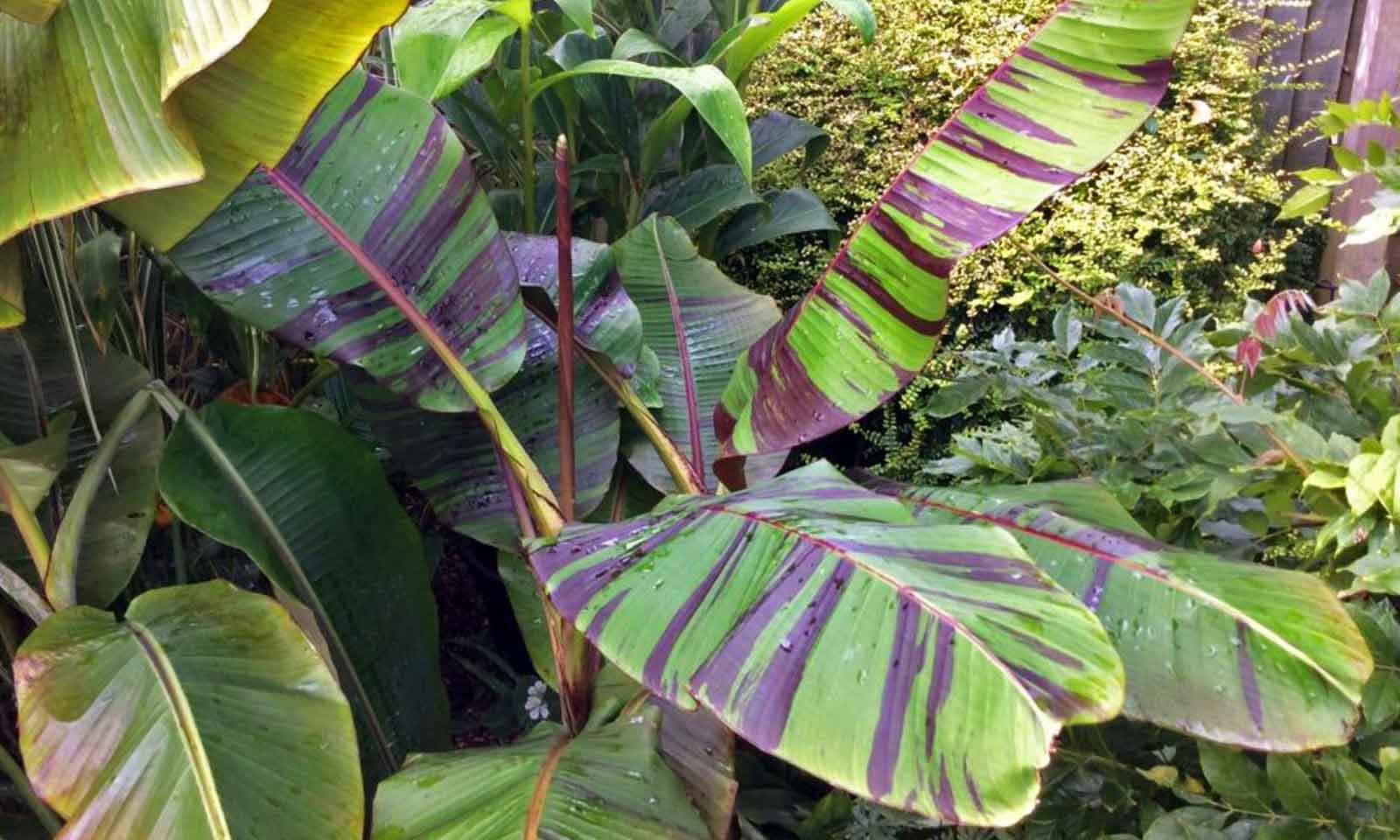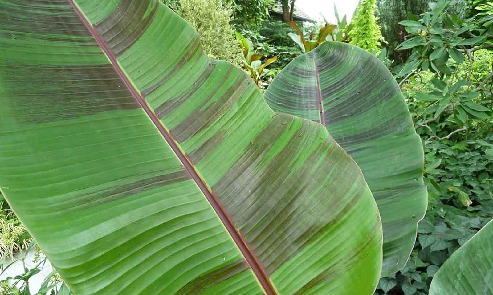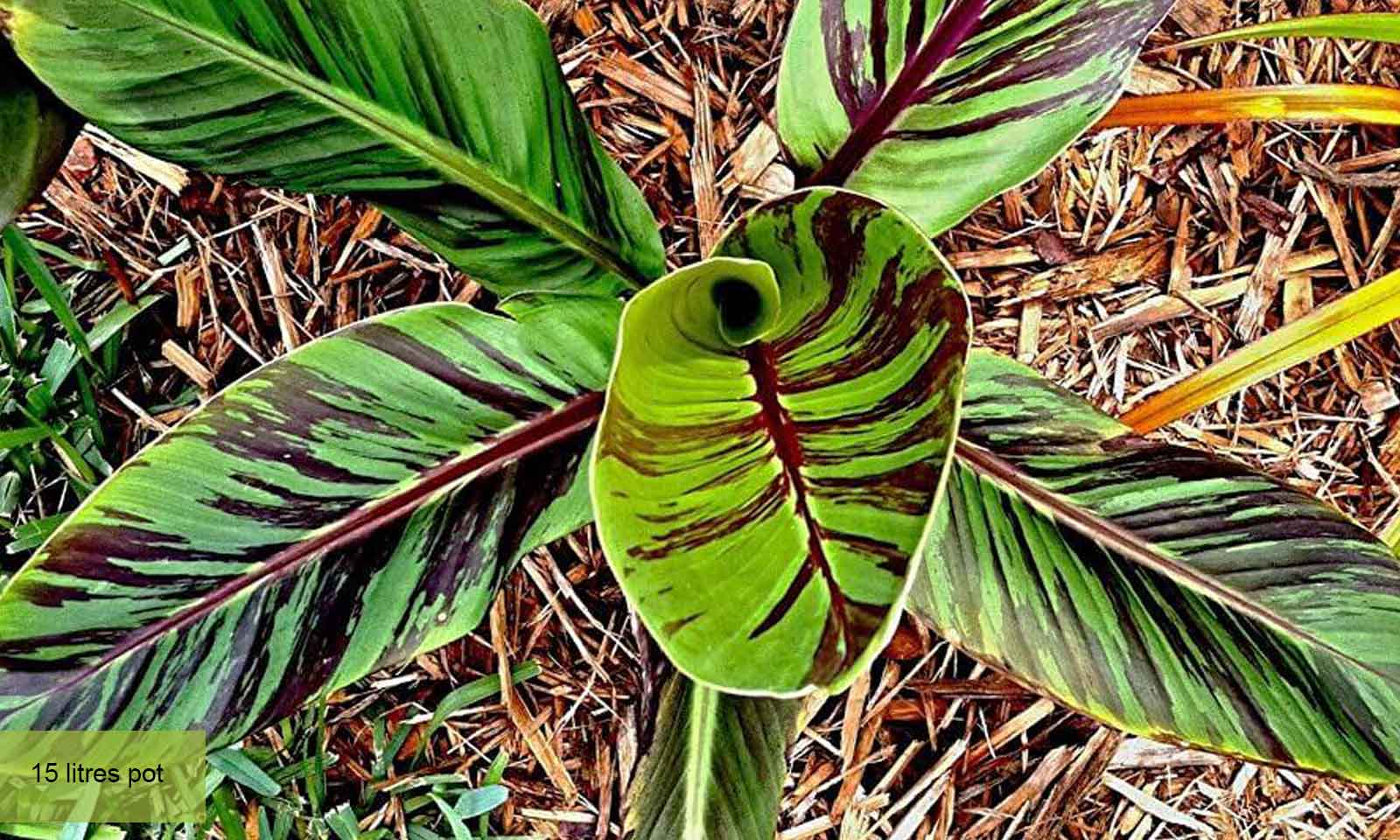 ‘Red Tiger’ is an upright, suckering perennial to 4m tall with large, glossy leaves with a maroon-red midrib, dark purple-red striping across the leaves on the upper surface and purple shading beneath. Mature plants may bear long-lasting, yellow-brown flowers enclosed in purple bracts from summer into autumn followed by yellowish fruits. These will create a tall, tree-like specimens with new fronds emerging as they grow. Leaf colour will typically become more uniformly green as they mature.