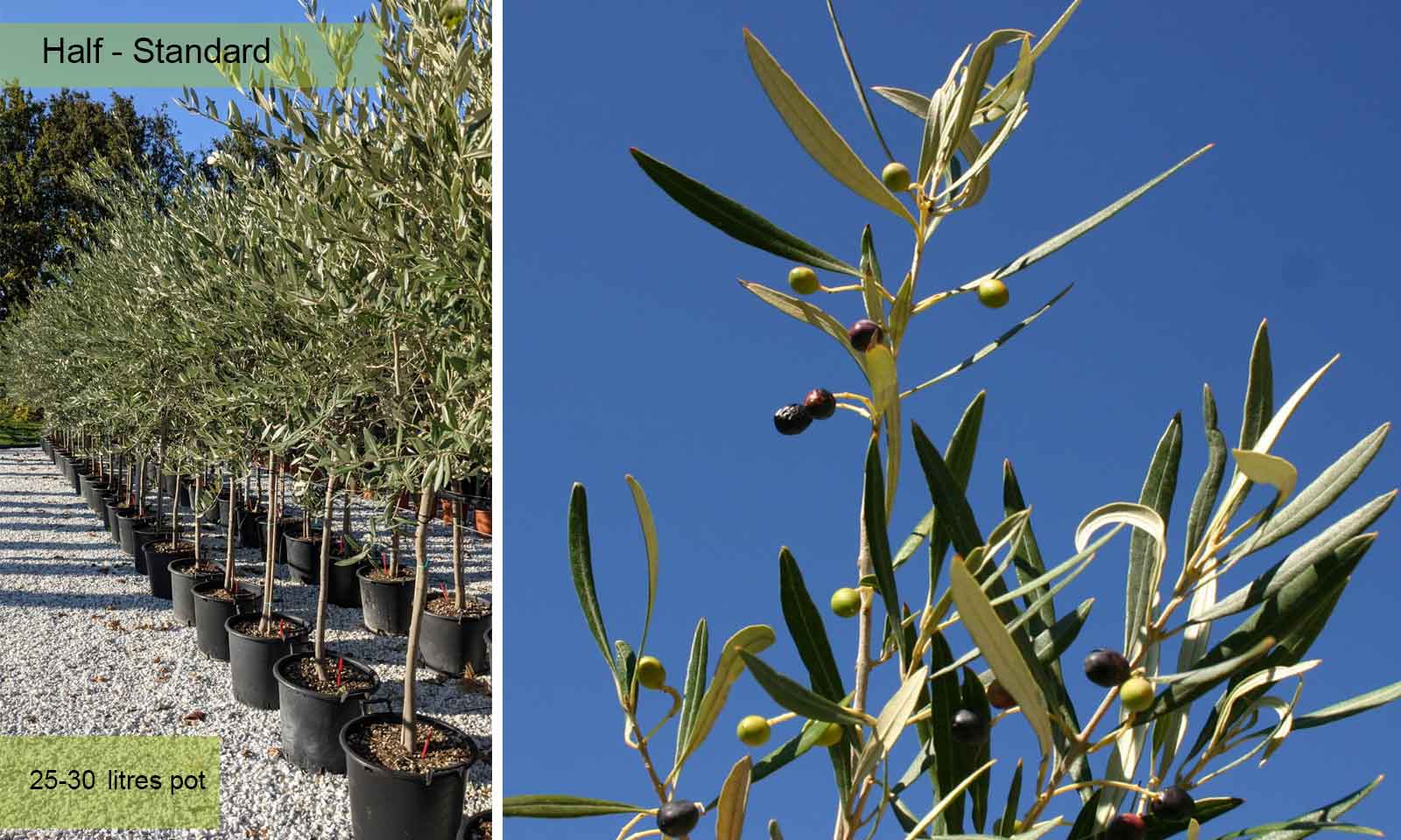 Olea Europaea olive fruit tree is increasingly being grown in containers as a Specimen Plant in UK gardens. The attractive evergreen foliage accounts for its popularity as the olive tree retains its pointed leathery grey-green leaves all year round.Tiny scented white flowers appear in late spring often followed later in the year by small, ornamental fruit. For the olive tree fruit to ripen fully, it needs a long, hot summer followed by a cooler winter, though the exact temperatures depend on the specific cultivar. Despite this, some gardeners in milder parts of the UK have managed to grow edible olives from their own olive tree. This plant needs plenty of natural sunlight and it has a hardiness rating of H4, making it very durable in the UK’s climate. Just make sure to shelter the plants during extreme cold snaps.Try to give this plant a once year trim and follow the guidelines of pruning group 1 for further ideas. The plant is generally disease free but has a potential problem with pests.