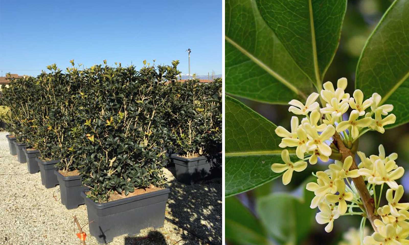 Evergreen shrub with upright, spreading, rounded habit. Leaves from elliptic to ovate, 6-8 cm long, 4-5 cm wide, leathery with margins that are usually acuminate, glossy dark green on the upper side, pale green underneath. Flowers in summer-autumn, pure white, axillary, not very showy as they are hidden by dense foliage but their presence is felt even at a distance because they leave a strong, sweet fragrance in the air. Very hardy, immune to disease, very resistant to parasites, grows well in all types of soil.