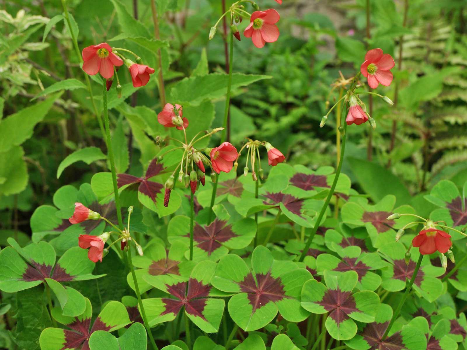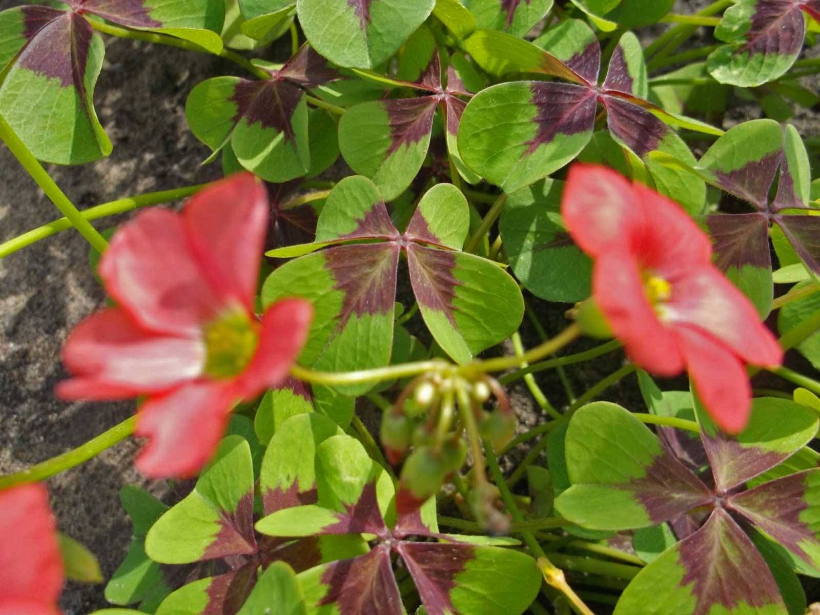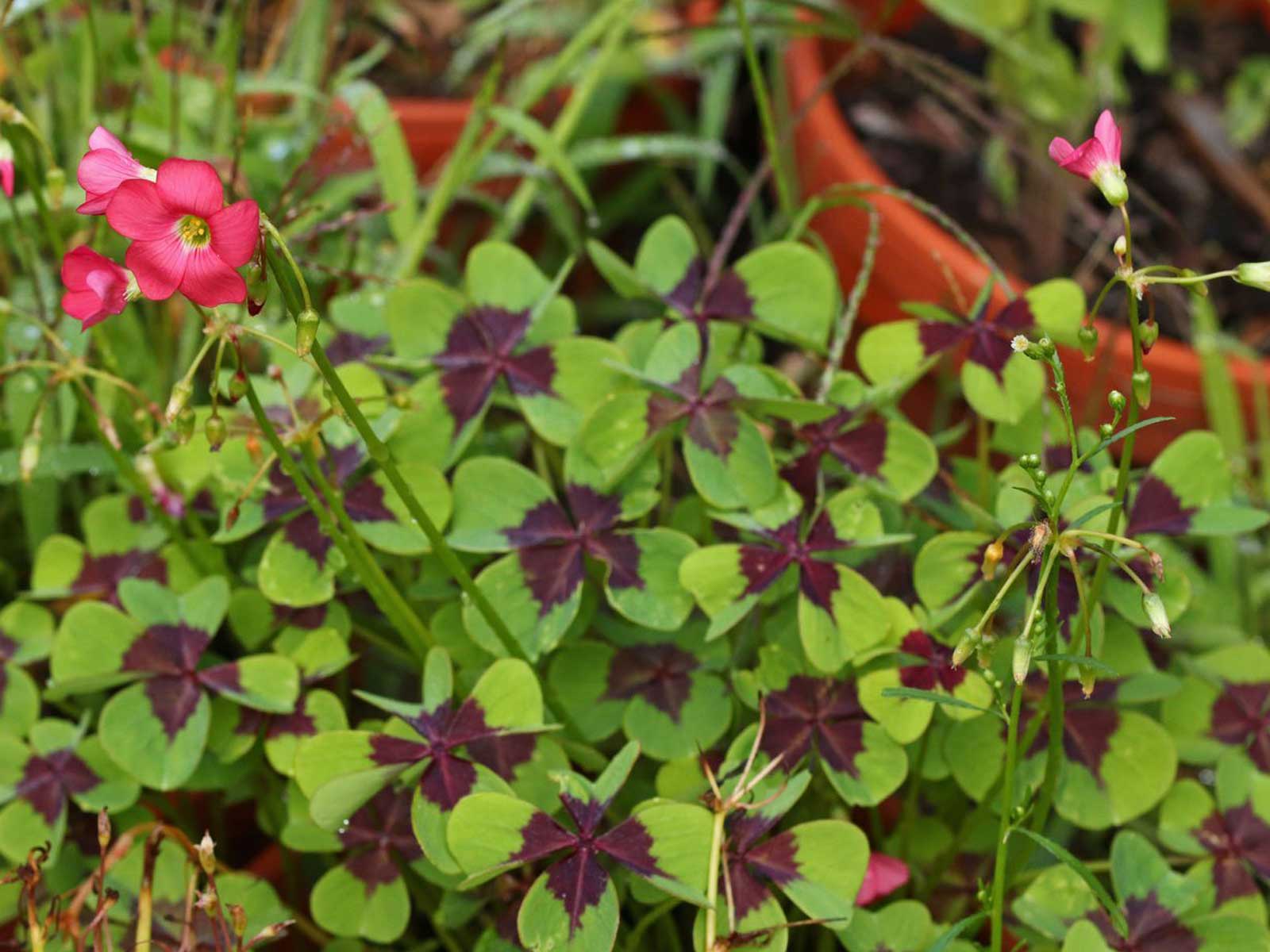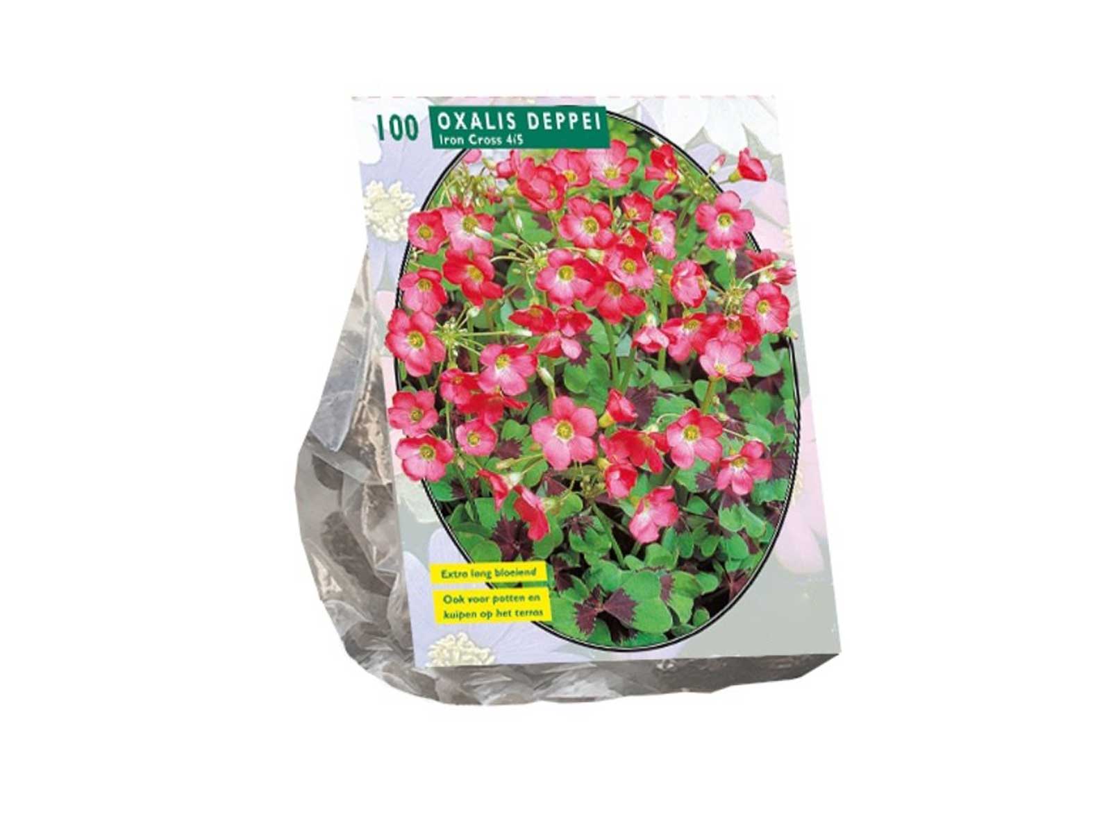 Oxalis deppei ‘Iron Cross’, also known as the Good Luck Plant or Lucky Clover, is a charming bulbous perennial recognized for its unique foliage and cheerful blooms. Each four-leaf clover-like leaf features bright green leaflets marked with a deep burgundy center, forming a distinctive cross shape. In summer, it produces delicate, funnel-shaped pink flowers that rise above the foliage, adding extra charm to borders, rock gardens, and containers.