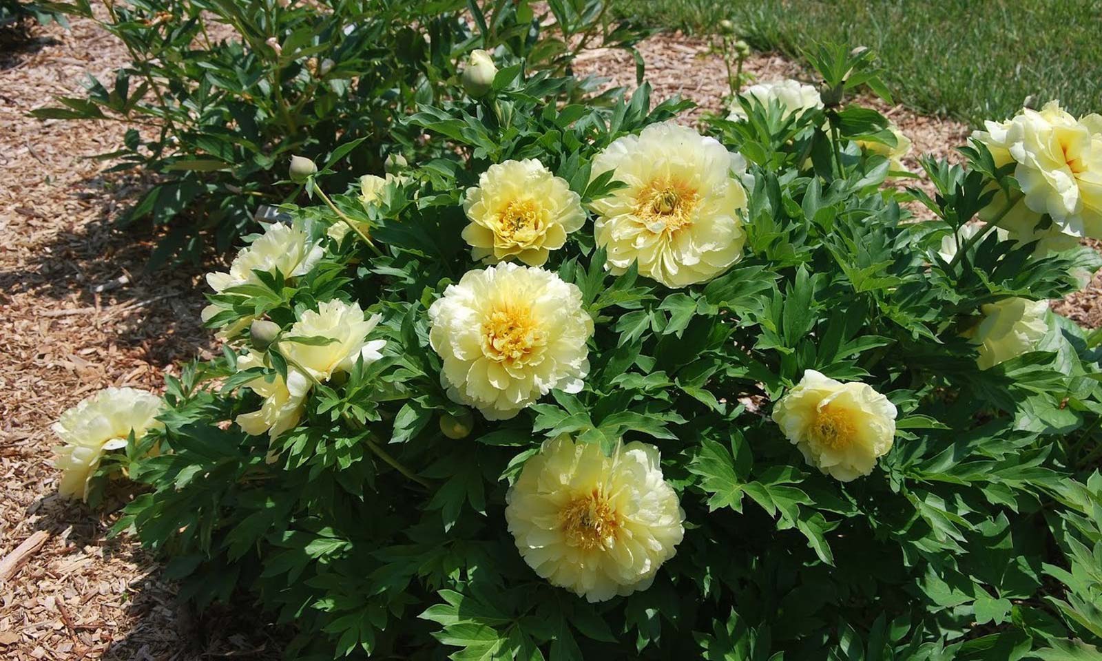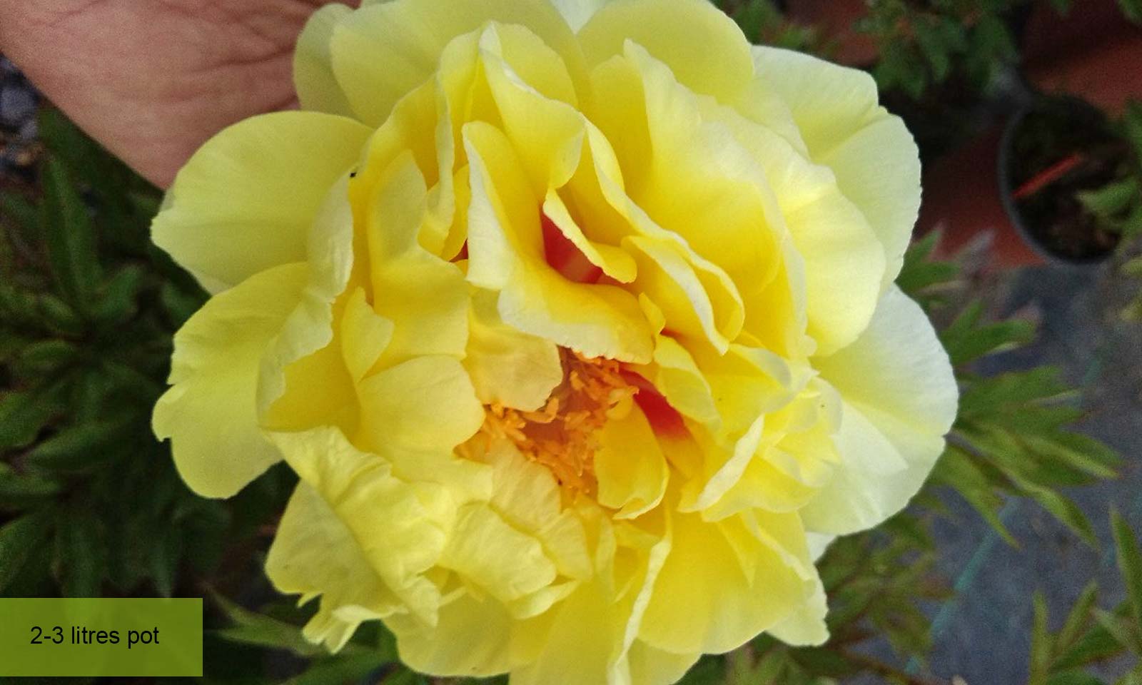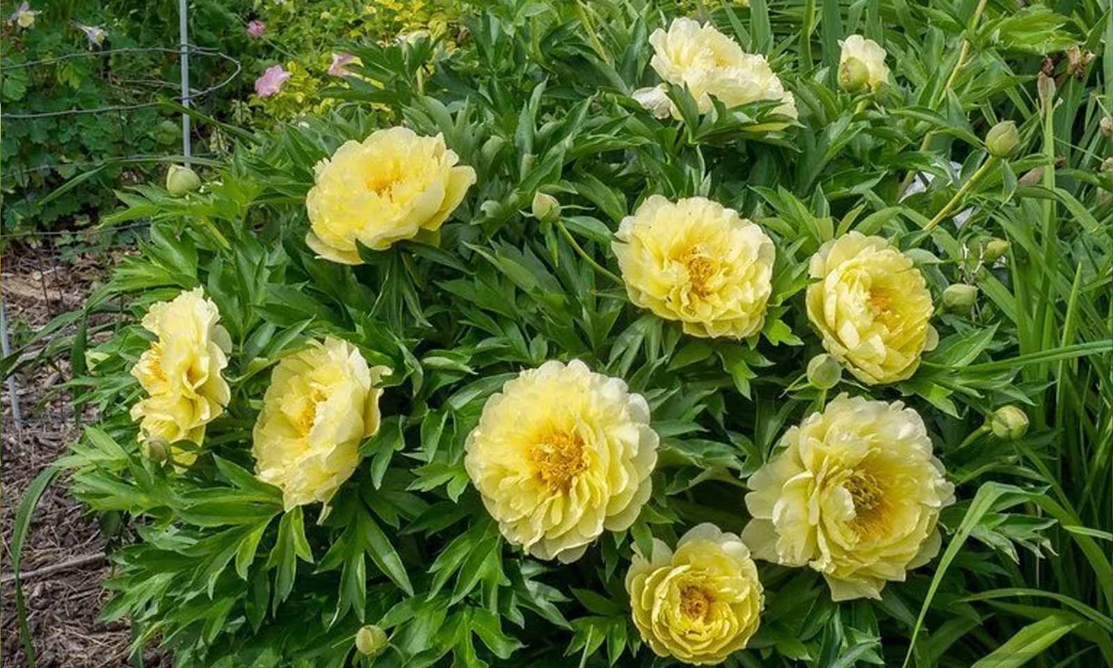 An intersectional hybrid between a tree peony and a herbaceous peony forming a plant about 80cm high with a woody base. It has deeply divided, mid-green leaves with pointed segments, and large, scented, semi-double to double, lemon-yellow flowers in early to mid-summer. An adult plant can produce up to 50 flowers. “Bartzella” won the gold medal for the best variety in 1986.