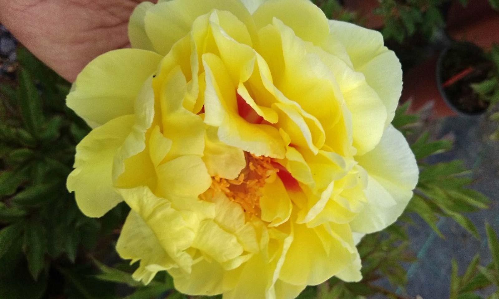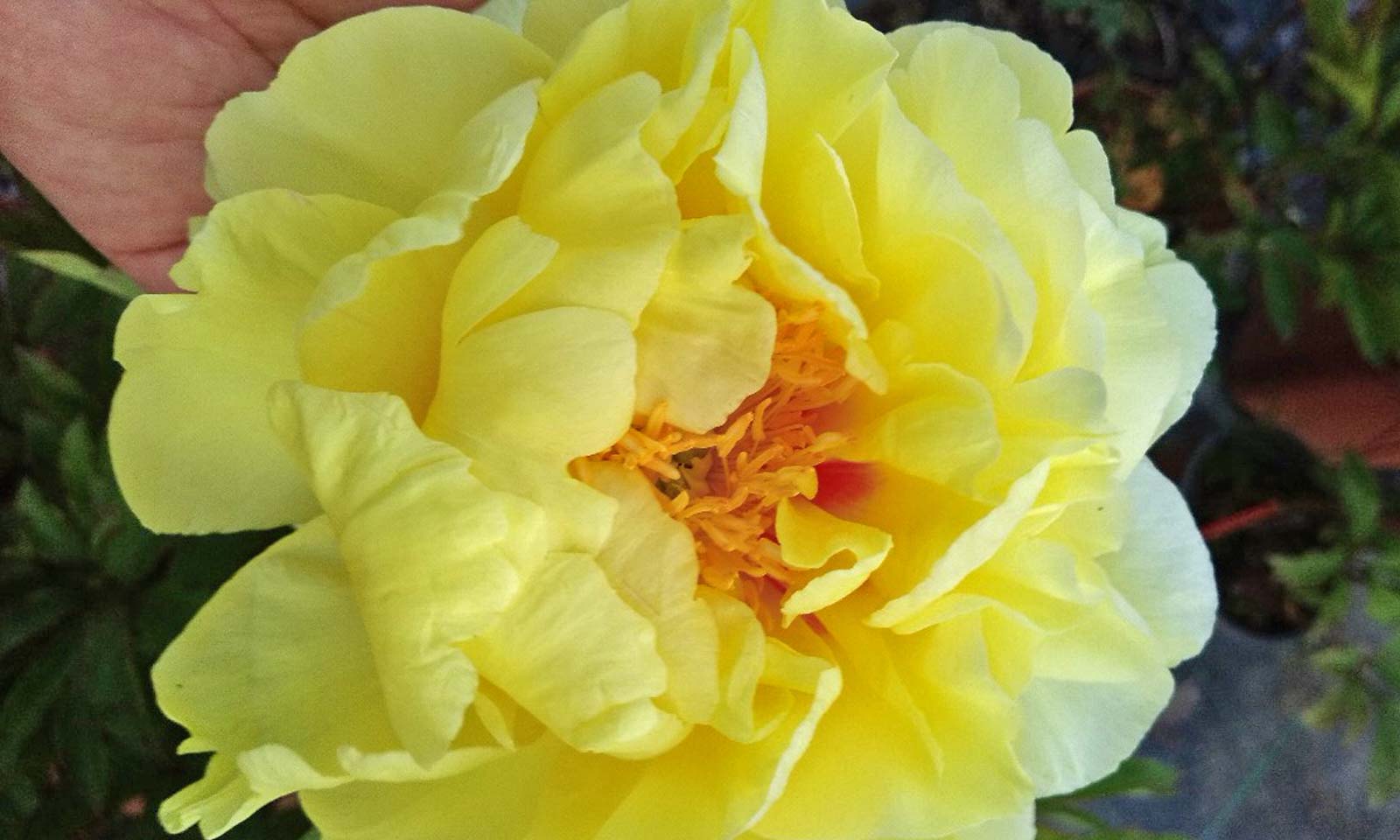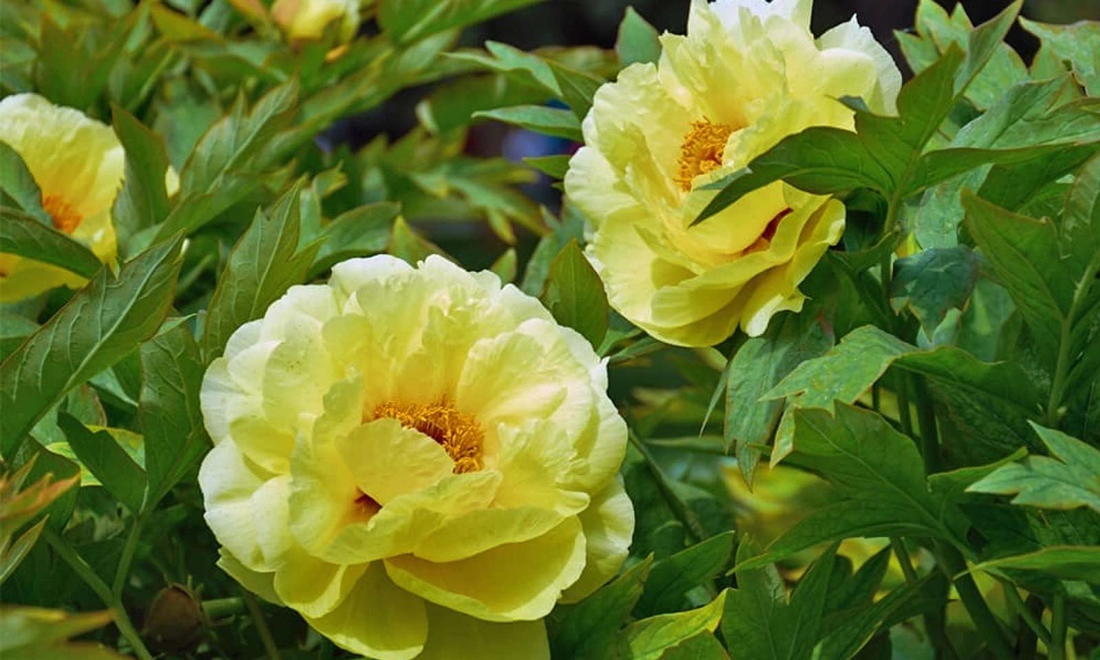 An intersectional hybrid between a tree peony and a herbaceous peony forming a plant about 80cm high with a woody base. It has deeply divided, mid-green leaves with pointed segments, and large, scented, semi-double to double, lemon-yellow flowers in early to mid-summer. An adult plant can produce up to 50 flowers. “Bartzella” won the gold medal for the best variety in 1986.