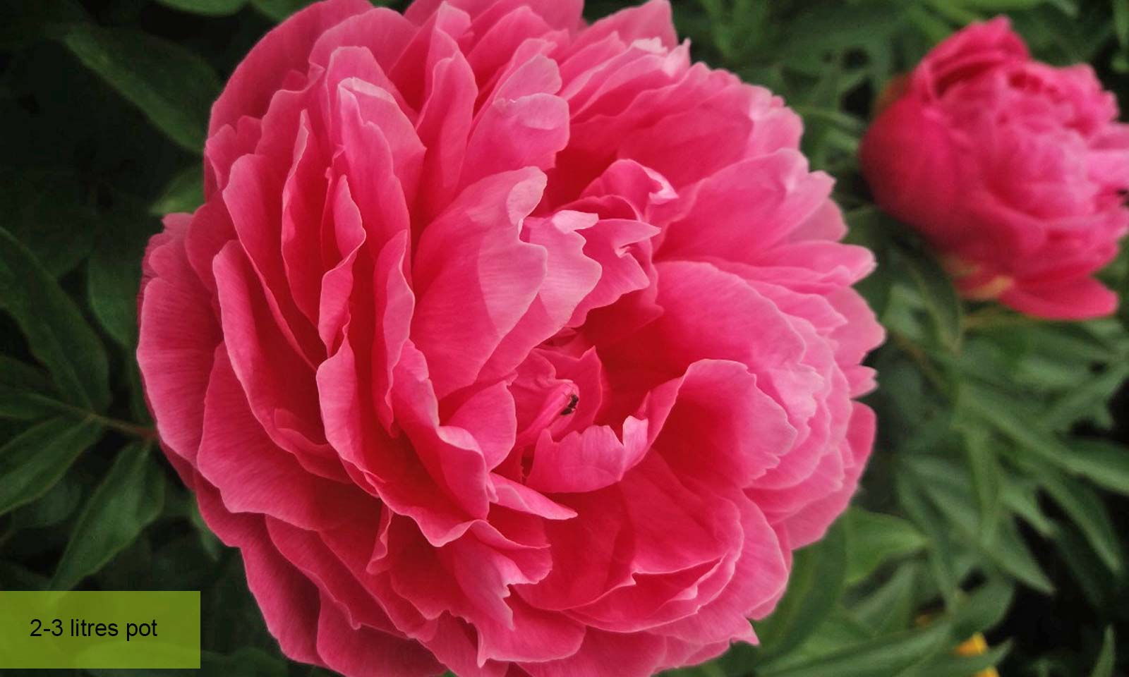 A clump-forming herbaceous perennial, to around 90cm high, with large, divided, slightly glossy deep green leaves. Large, full double flowers are produced in late spring and early summer, opening mid pink and fading to near-white with pink edges.