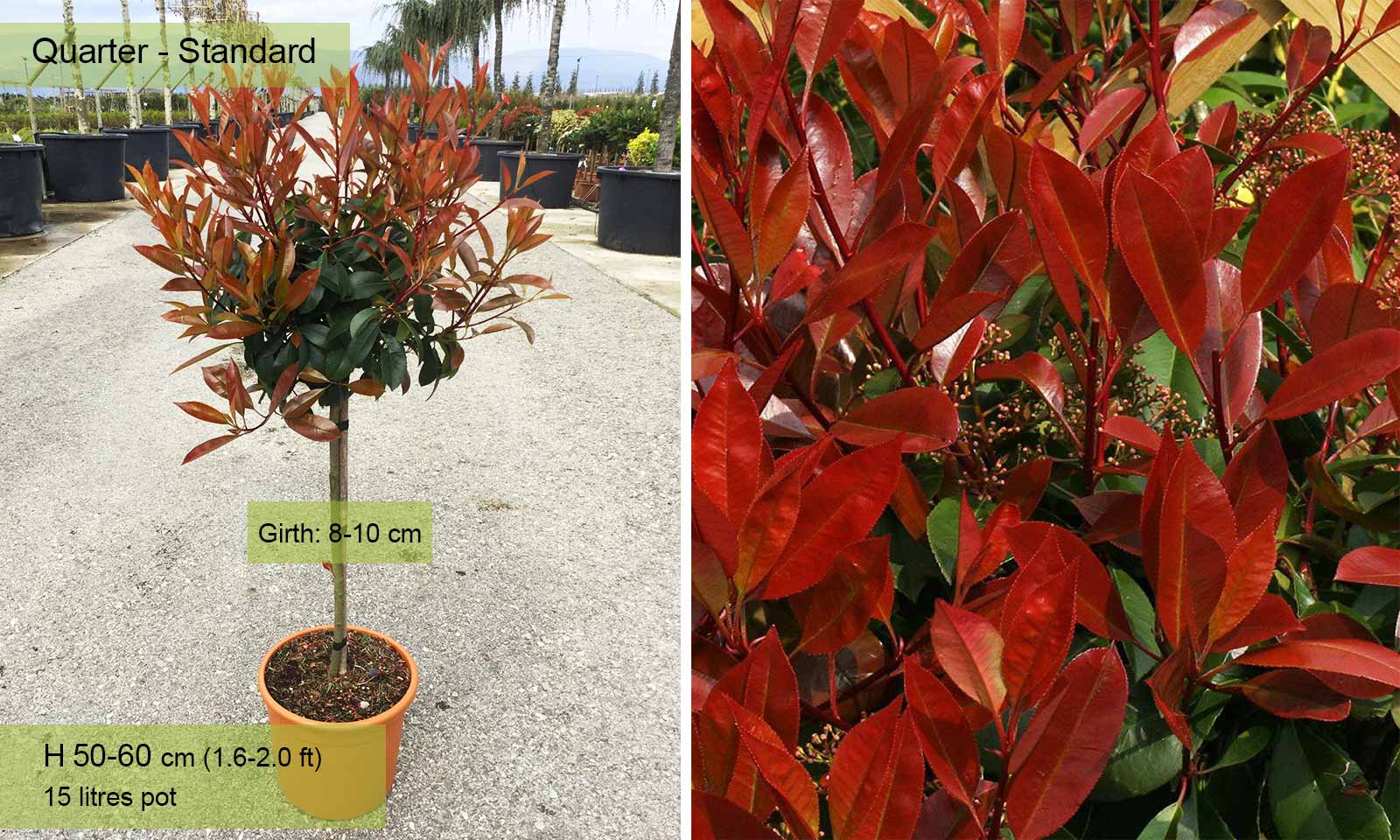 Photinia x Fraseri Red Robin, also known as Photinia Serrulata Red Robin or occasionally the Christmas Berry, is a group of evergreen shrubs grown specifically for glossy, dark green adult foliage, white flowers and brilliant red tinted young leaves; in the spring, they unfold to give a stunning display. The best known of the photinias is Photinia Red Robin, which is often planted as a specimen shrub or as a dense, evergreen hedge.