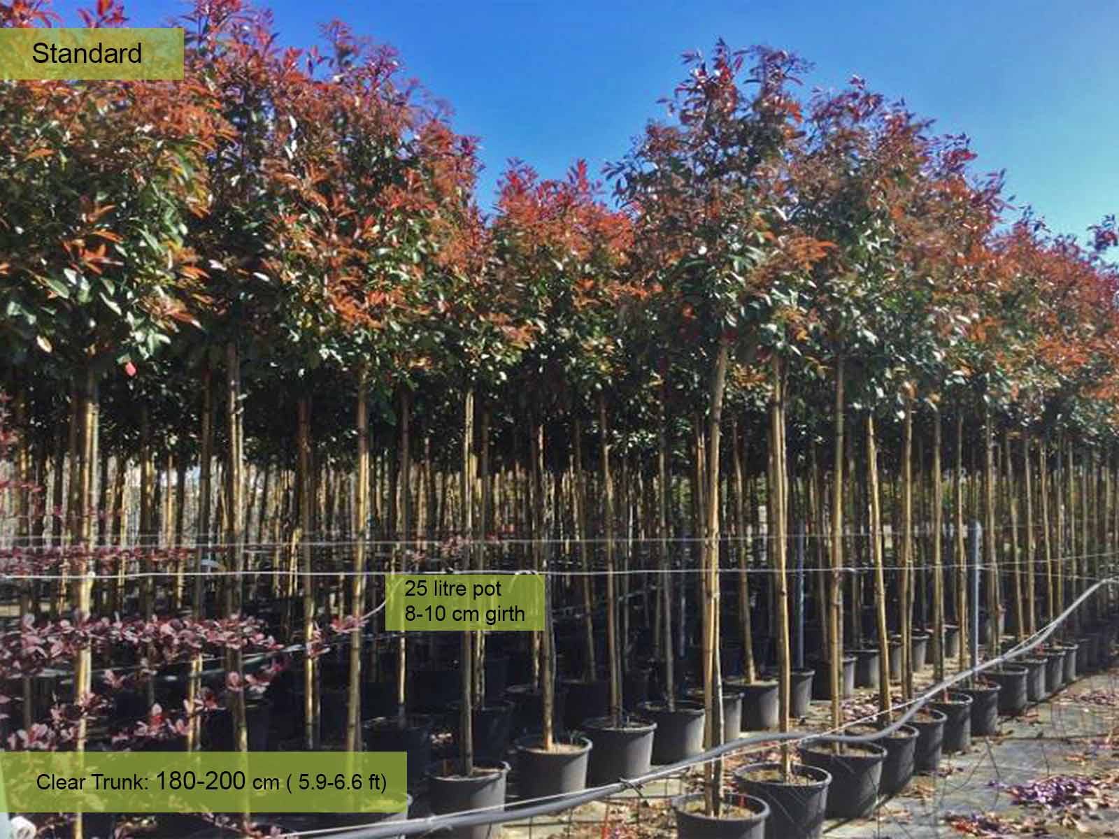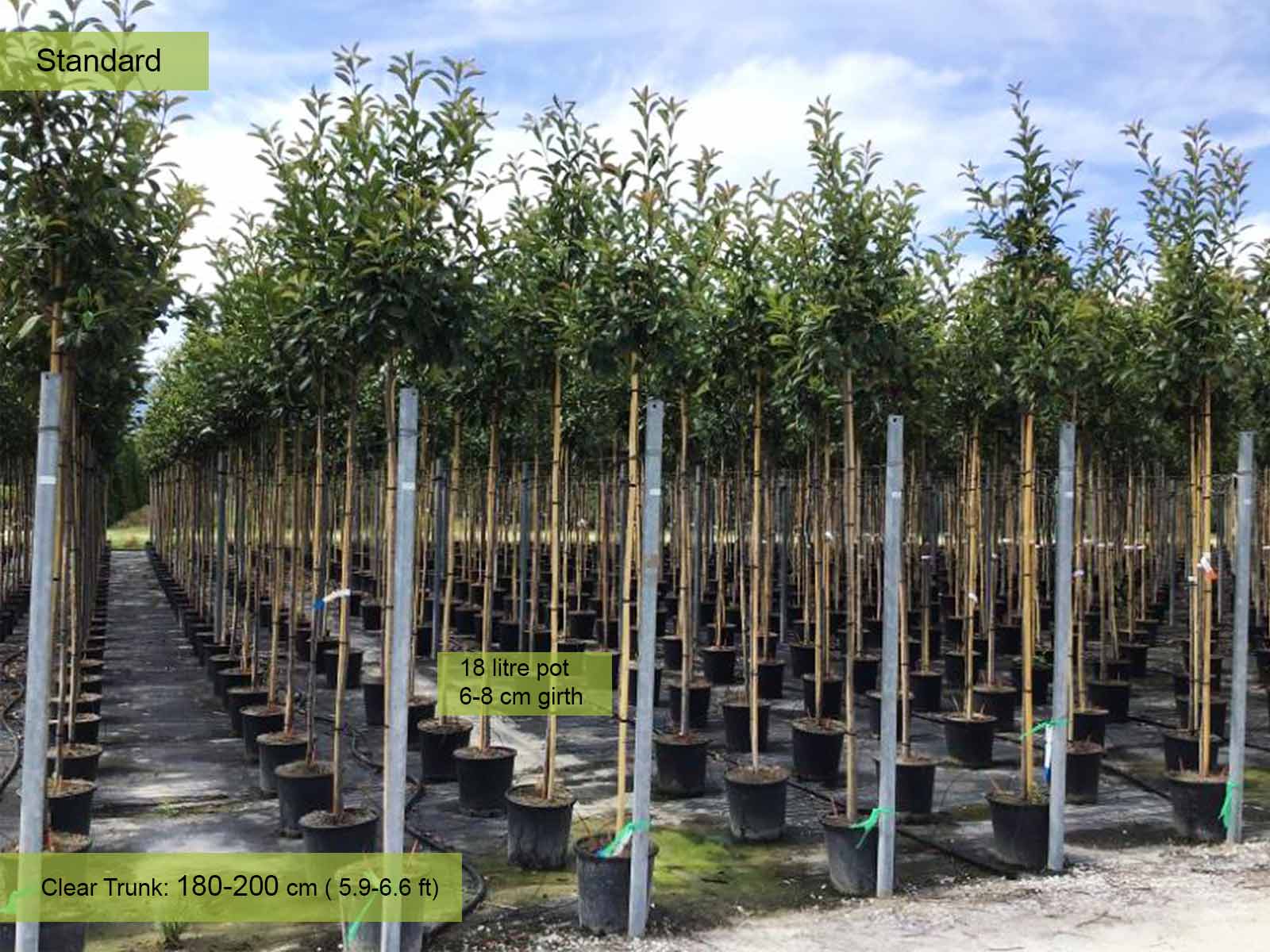 Girth 14-16 cm: 110 litre pot, clear trunk – 180-200 cm (5.9-6.6 ft), crown – 60-90 cm (2.0-2.9 ft);