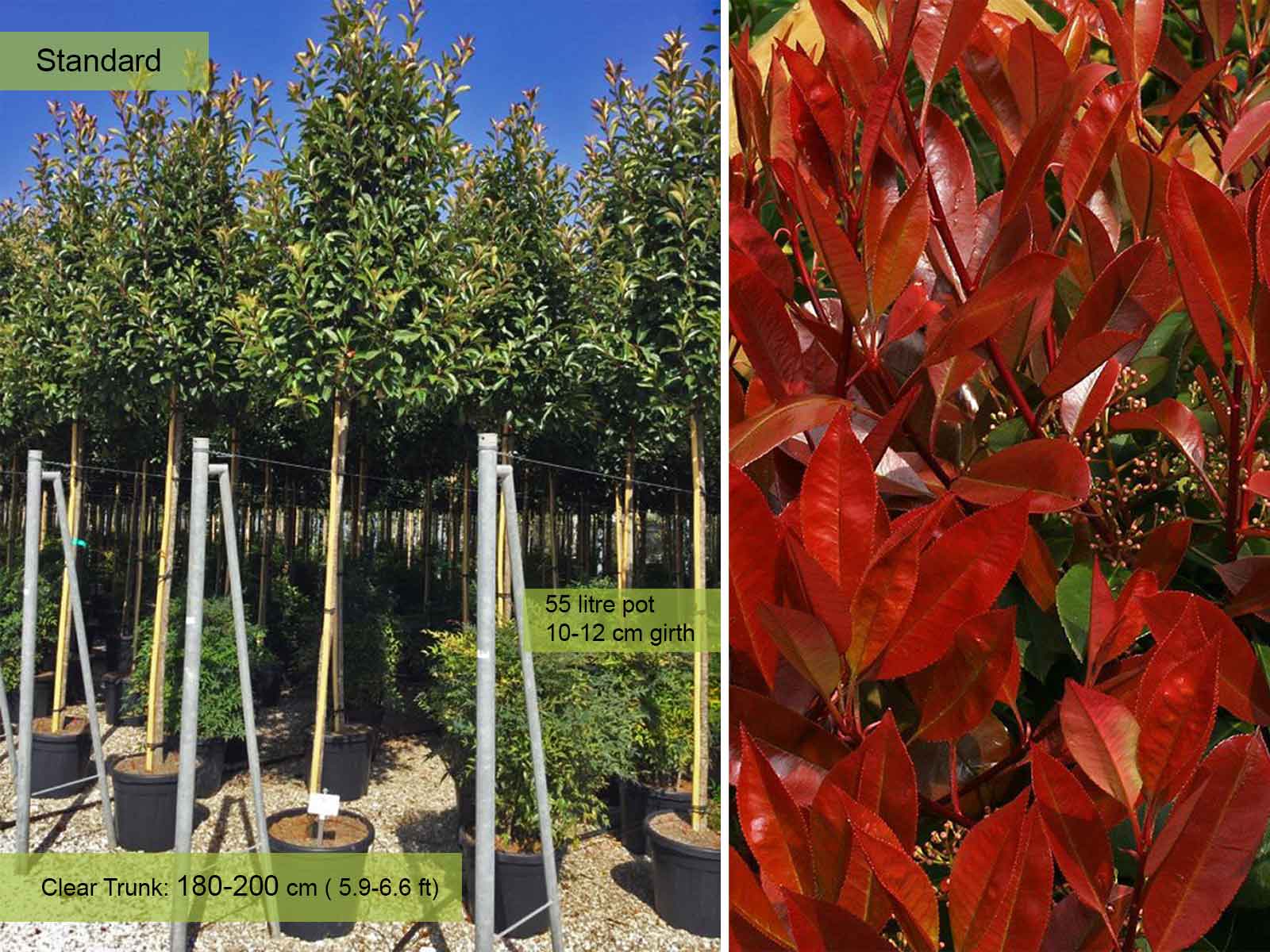 Photinia x Fraseri Red Robin, also known as Photinia Serrulata Red Robin or occasionally the Christmas Berry, is a group of evergreen shrubs grown specifically for glossy, dark green adult foliage, white flowers and brilliant red tinted young leaves; in the spring, they unfold to give a stunning display. The best known of the photinias is Photinia Red Robin, which is often planted as a specimen shrub or as a dense, evergreen hedge.