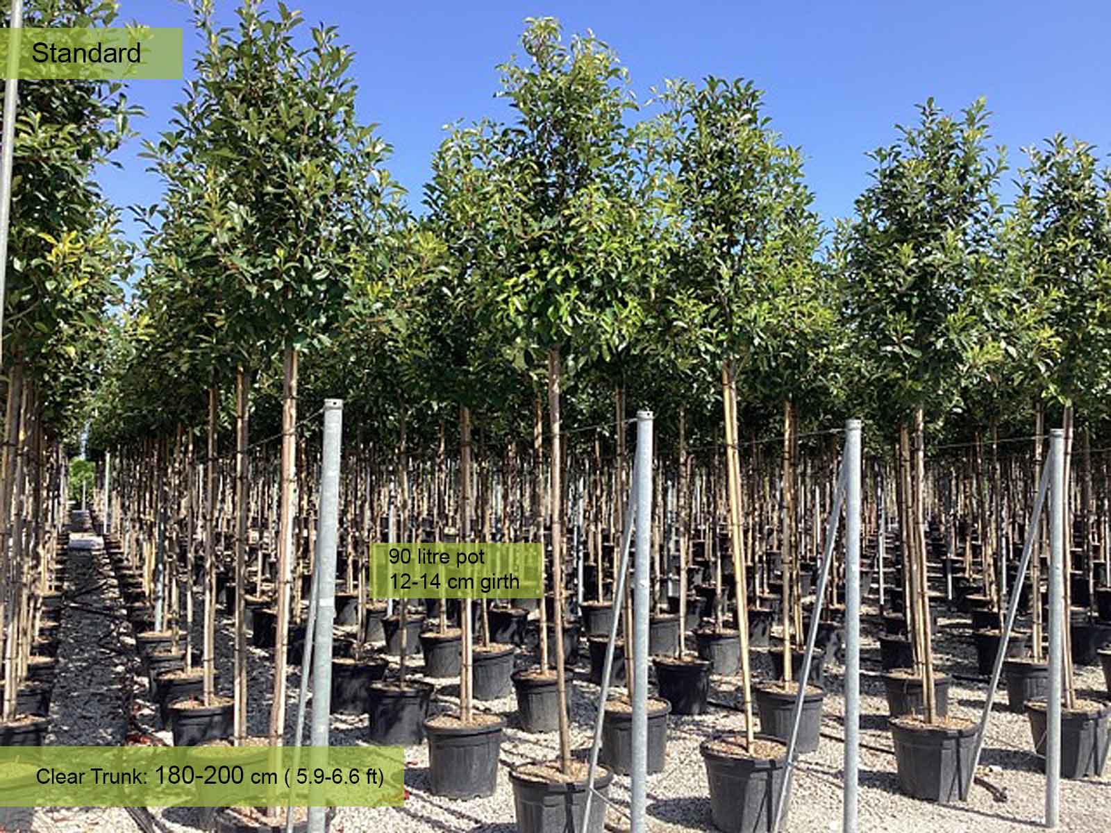 Girth 12-14 cm: 90 litre pot, clear trunk – 180-200 cm (5.9-6.6 ft), crown – 60-80 cm (2.0-2.6 ft);