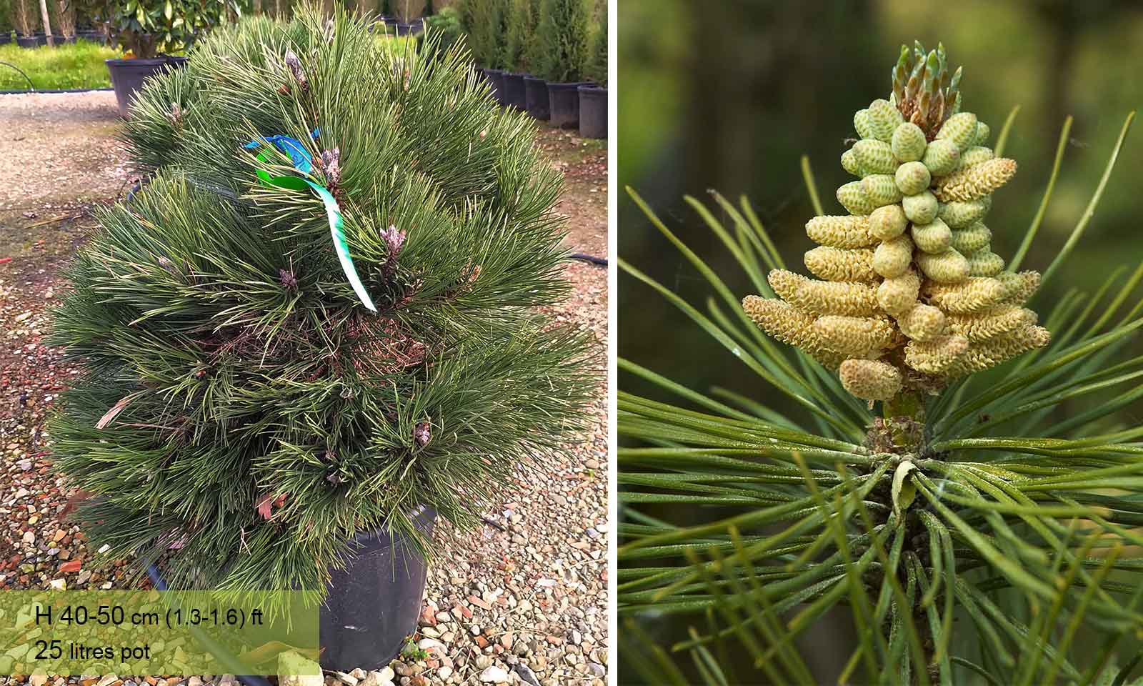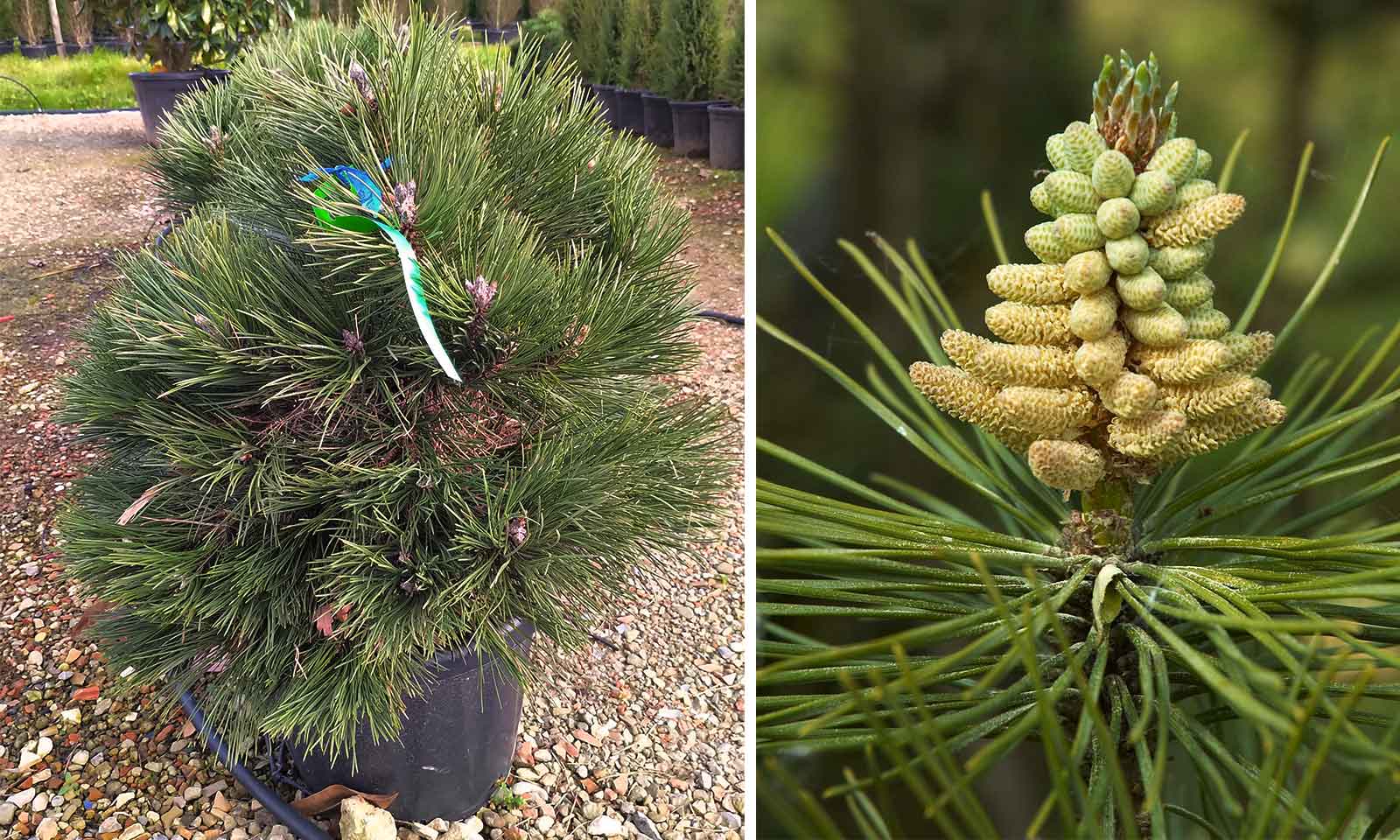 Dwarf form of Pinus Nigra Austriaca – conifer typical to the Alps with regular, pyramidal habit. Rigid needles, 8-12cm long, dark green. Female flowers are red, in pairs at the tips of the new growth. Male flowers are yellow, grouped at the base of the new growth. Young cones are green and long; when mature they become large, brown and round. Mountain species which prefers snowy winters and not too humid summers. Grows well in all types of soil, even clay, and tolerates calcareous.