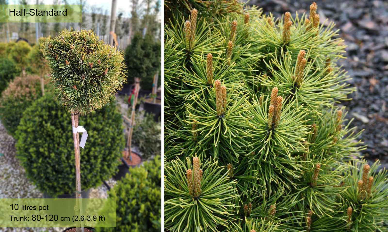 Pinus can be shrubs or large, evergreen trees, some species with attractive bark, developing an irregular outline with age and bearing long needle-like leaves in bundles of 2, 3 or 5. Pinus ‘Winter Sun’ is a dwarf pine trained as a half-standard tree, with pairs of deep green needles, turning lime-yellow in winter.