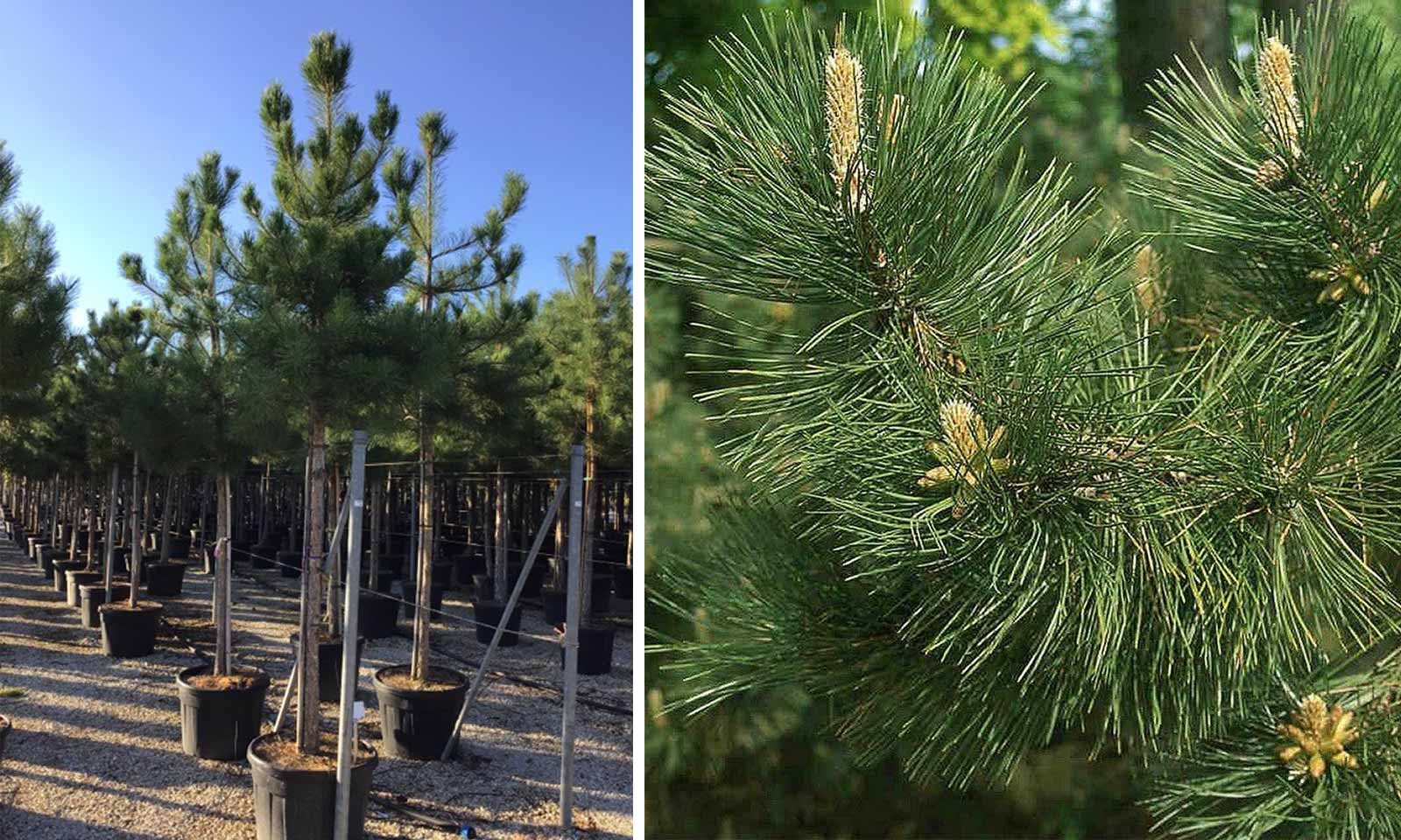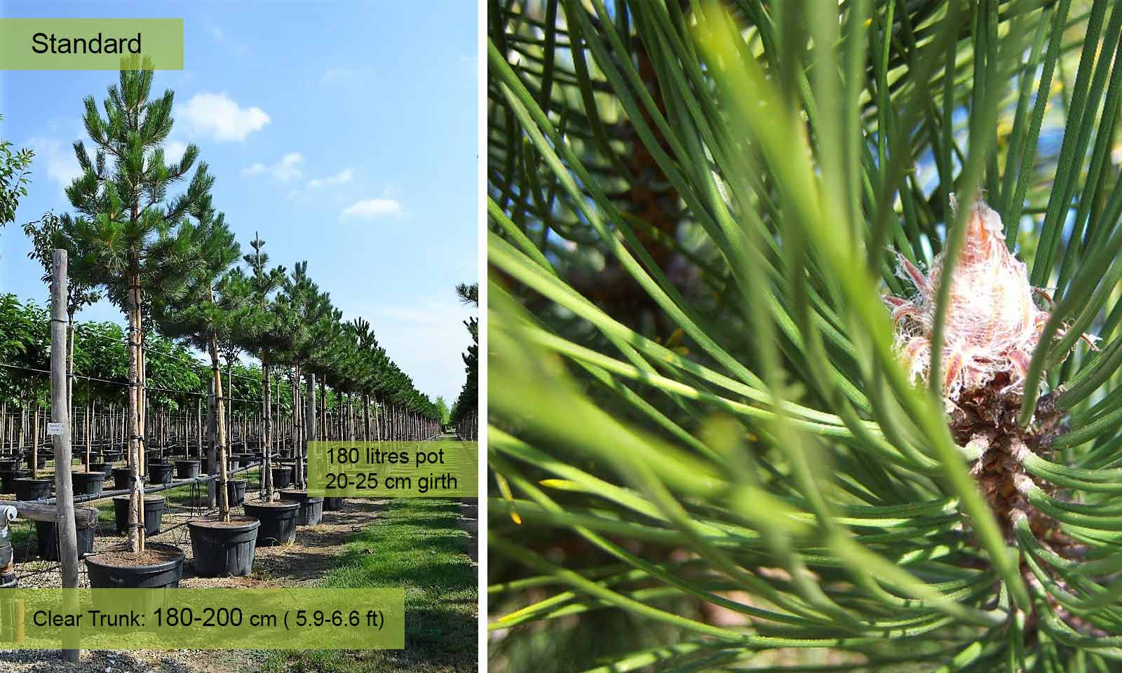 Conifer typical to the Alps with regular, pyramidal habit, dense and remaining branched from the ground for many years. Characteristic greyish-brown bark, rough and split; as the plant grows old the bark is covered in pale patches. Rigid needles, 8-12cm long, dark green. Female flowers are red, in pairs at the tips of the new growth. Male flowers are yellow, grouped at the base of the new growth. Young cones are green and long; when mature they become large, brown and round. Mountain species which prefers snowy winters and not too humid summers. Grows well in all types of soil, even clay, and tolerates calcareous.