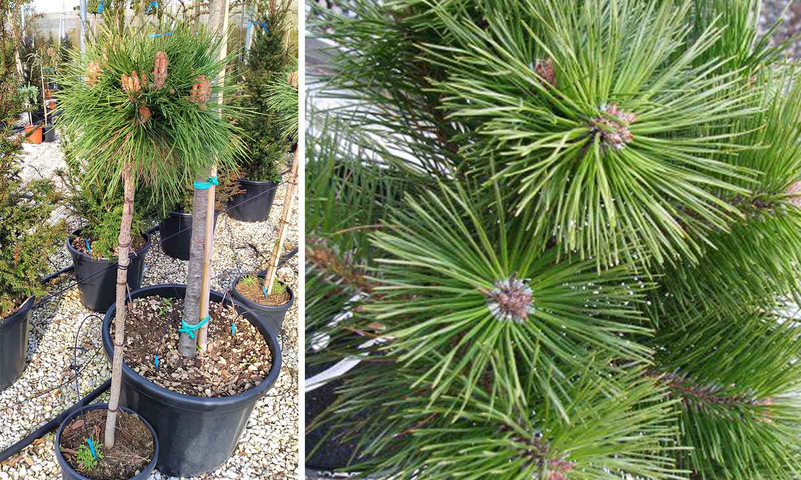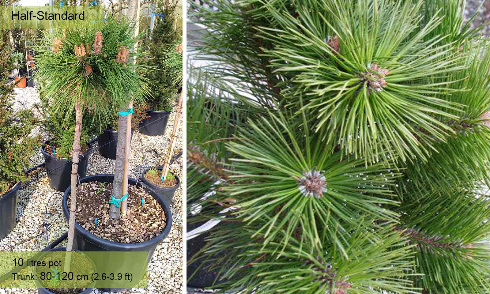 Selected in Switzerland, it naturally has a spherical and compact habit without pruning. Long, vibrant, dark green needles; the central ones become pale in autumn and fall in winter, while the external ones remain green throughout the year. Grafted on trunk of Pinus Nigra Austriaca, it forms a nice little tree with very compact, spherical crown.