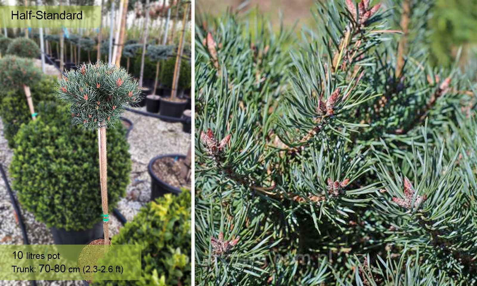 Beautiful half-standard conifer with stunning green needles with blue tones. Requires well -drained and dry soil, slightly acid. Very hardy, not harmed by early or late frosts, withstands heat and drought, resistant to wind.