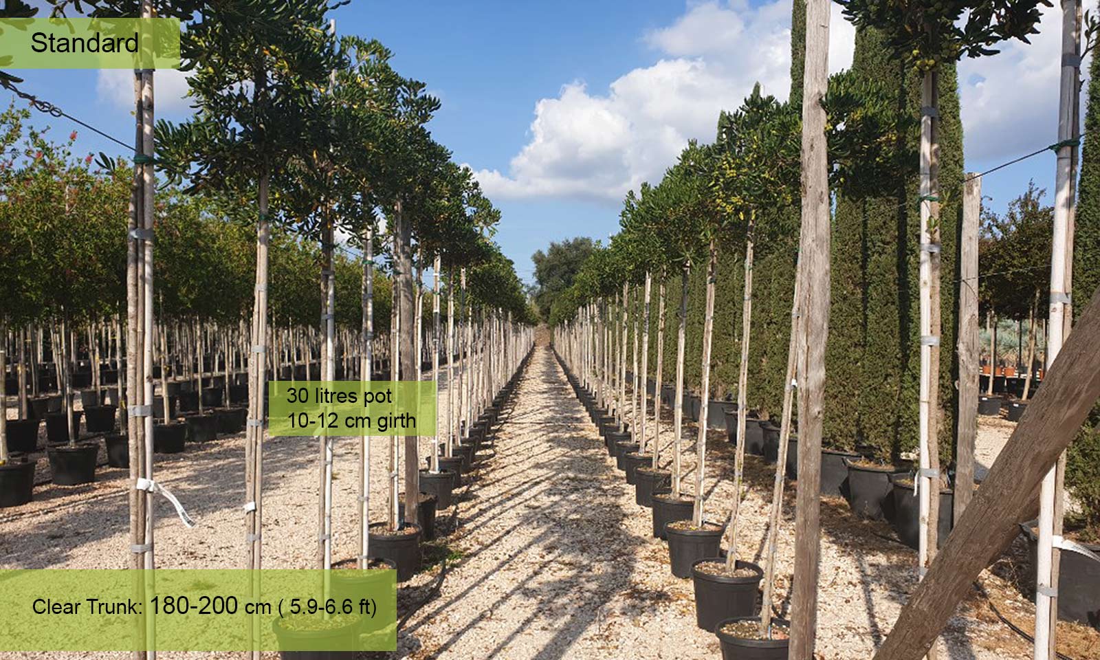 Girth 10-12 cm: 30 litre pot, clear trunk – 180-200 cm (5.9-6.6 ft), crown – 40-60 cm (1.3-2.0 ft);