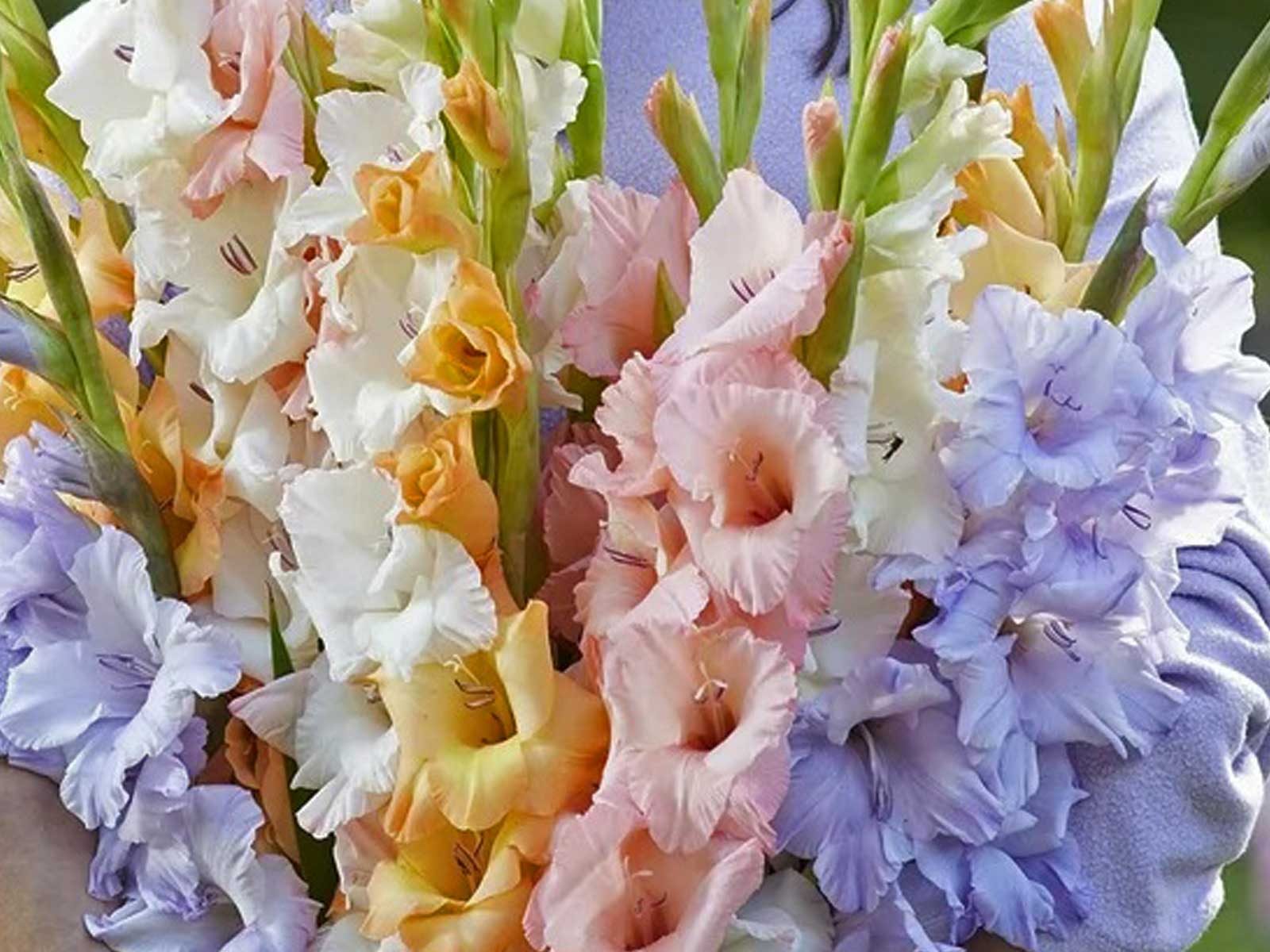 PLUKGELUK | Gladiolus Pastel Blend is a dreamy mix of gladioli in soft, romantic shades of blush pink, creamy white, lavender, and peach. These tall, elegant blooms add a touch of sophistication to borders, beds, and cut flower arrangements, creating a graceful and airy garden display. Their gently ruffled petals and sturdy stems make them a favorite for floral bouquets.