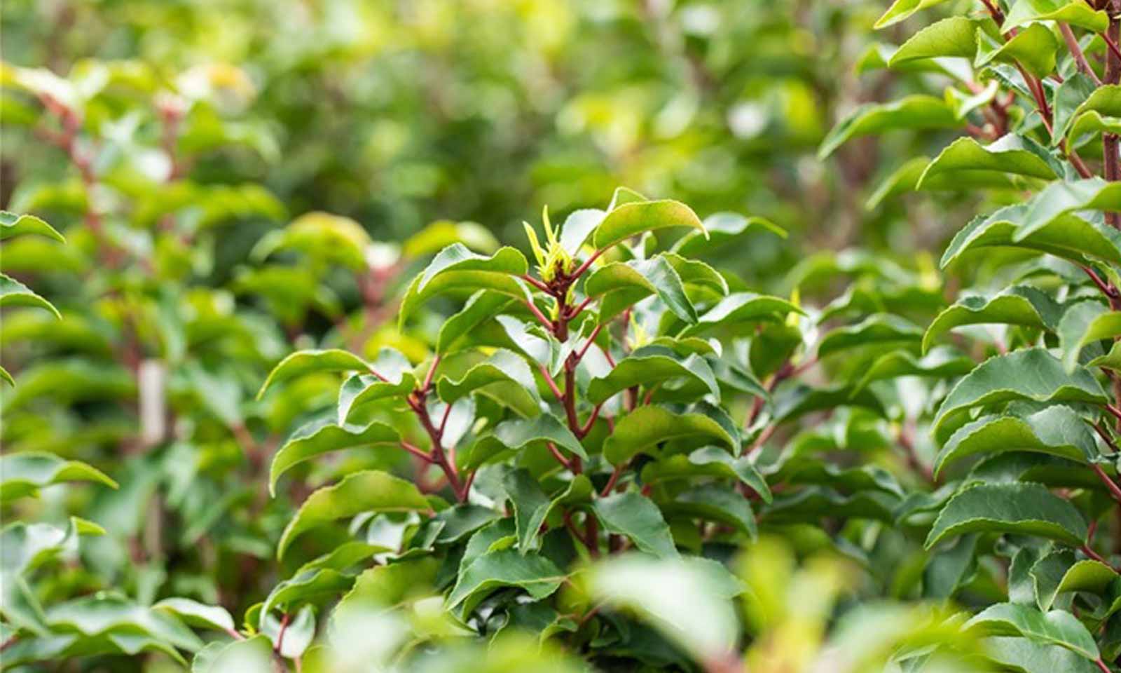 The glossy foliage provides a lush and attractive backdrop for garden landscapes, adding texture and depth to any planting scheme. In late spring to early summer, ‘Brenelia’ produces clusters of small, creamy-white flowers that emit a sweet, almond-like fragrance.