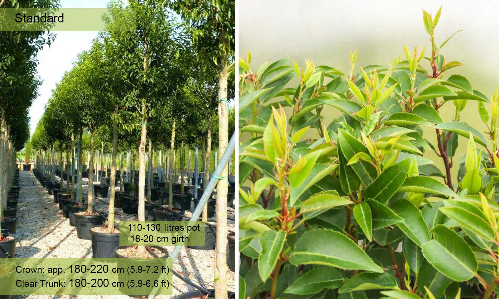 Girth 18-20 cm: 110-130 litre pot, clear trunk – 180-200 cm (5.9-6.6 ft), crown – 180-220 cm (5.9-7.2 ft);