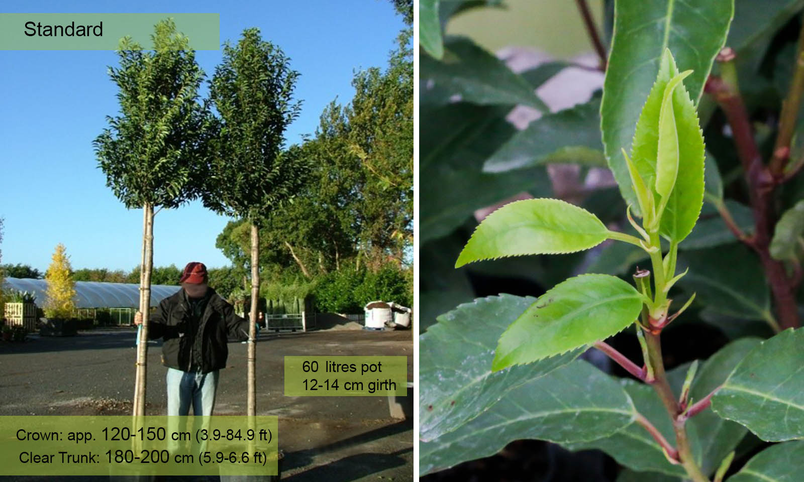Girth 12-14 cm: 60 litre pot, clear trunk – 180-200 cm (5.9-6.6 ft), crown – 120-150 cm (3.9-4.9 ft);