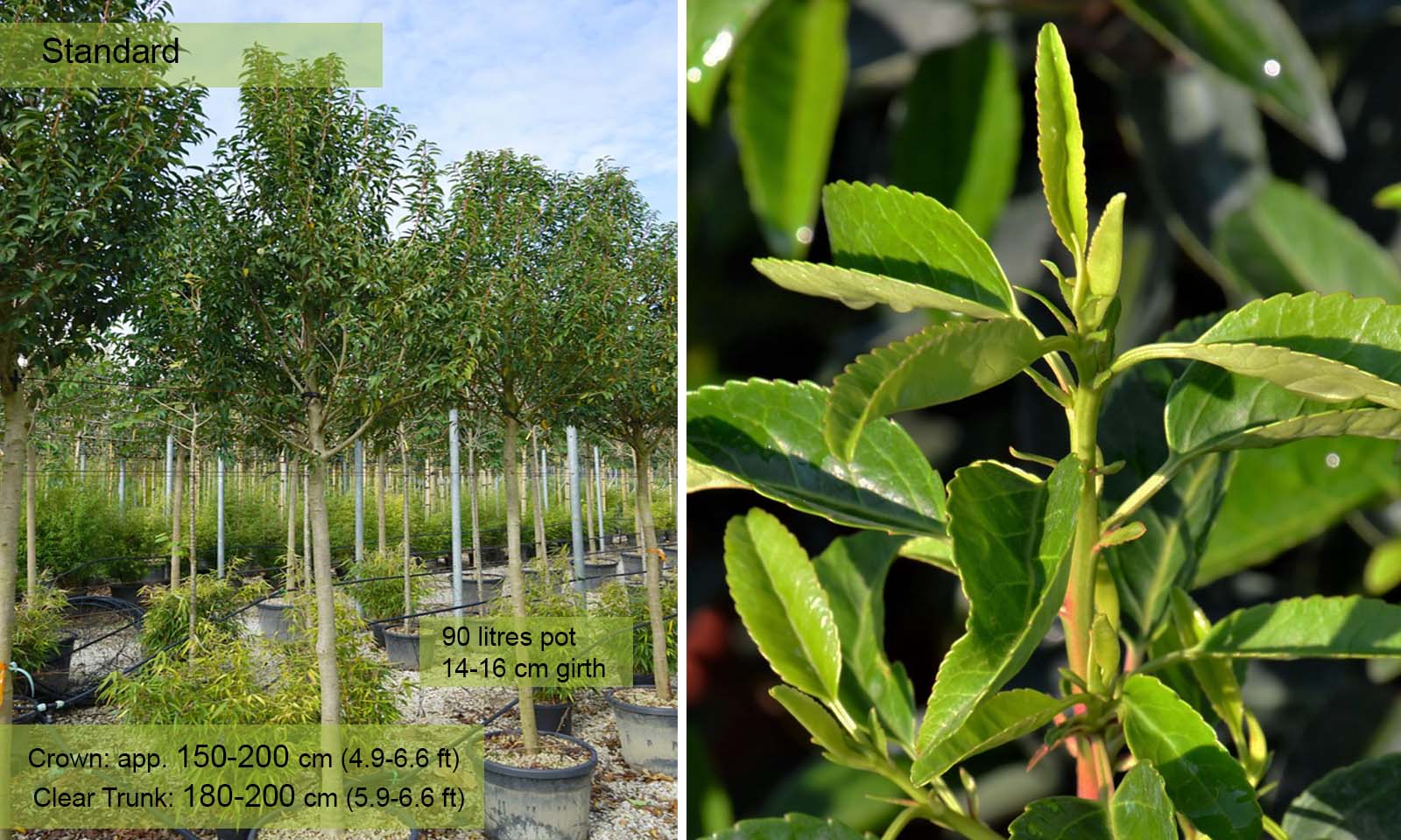 Girth 14-16 cm: 90 litre pot, clear trunk – 180-200 cm (5.9-6.6 ft), crown – 150-200 cm (4.9-6.6 ft);